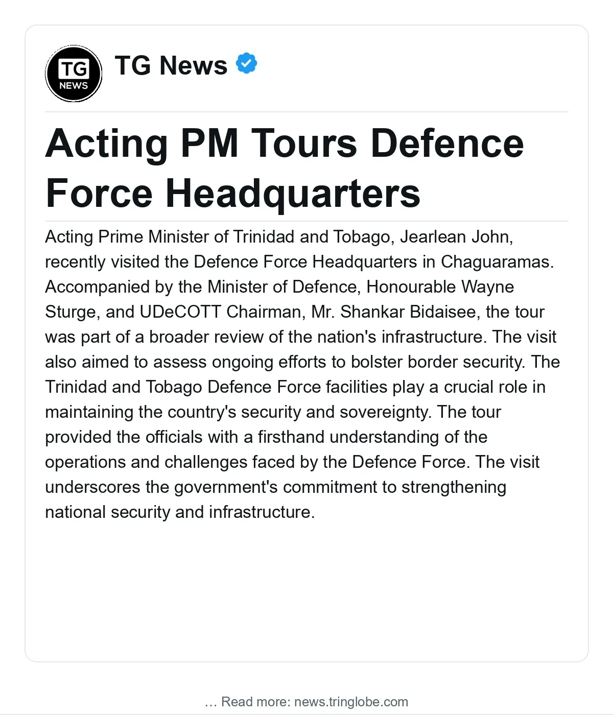 Acting Prime Minister of Trinidad and Tobago, Jearlean John, recently visited the Defence Force Headquarters in Chaguaramas. Accompanied by the Minister of Defence, Honourable Wayne Sturge, and UDeCOTT Chairman, Mr. Shankar Bidaisee, the tour was part of a broader review of the nation’s infrastructure. The visit also aimed to assess ongoing efforts to bolster border security. The Trinidad and Tobago Defence Force facilities play a crucial role in maintaining the country’s security and sovereignty. The tour provided the officials with a firsthand understanding of the operations and challenges faced by the Defence Force. The visit underscores the government’s commitment to strengthening national security and infrastructure.