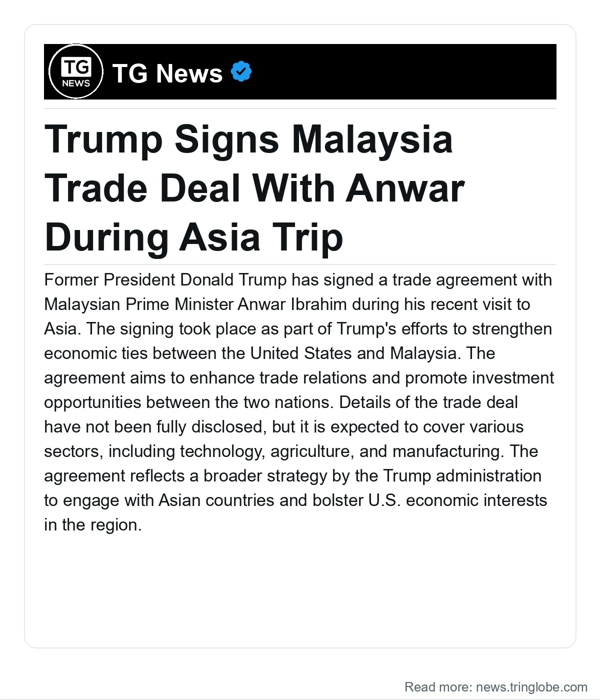 Details of the trade deal have not been fully disclosed, but it is expected to cover various sectors, including technology, agriculture, and manufacturing. The agreement reflects a broader strategy by the Trump administration to engage with Asian countries and bolster U.S. economic interests in the region.
