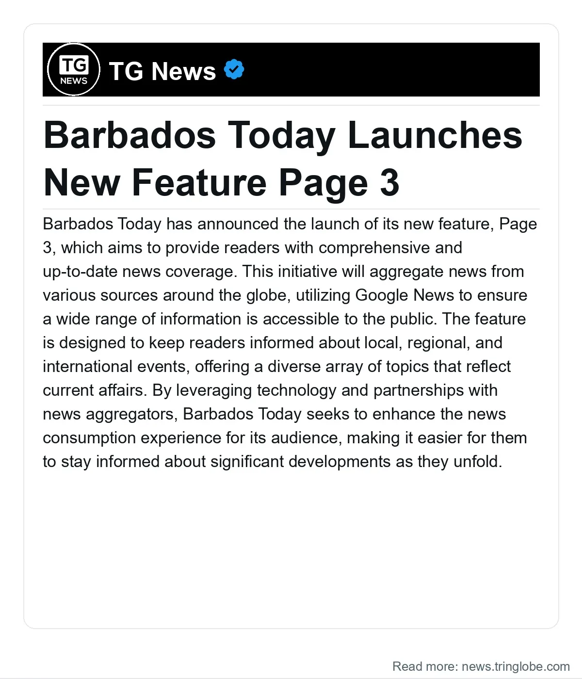 Barbados Today has announced the launch of its new feature, Page 3, which aims to provide readers with comprehensive and up-to-date news coverage. This initiative will aggregate news from various sources around the globe, utilizing Google News to ensure a wide range of information is accessible to the public.