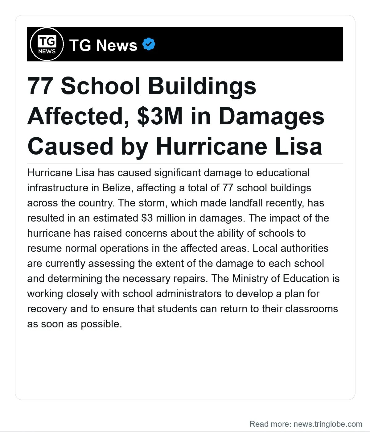 Hurricane Lisa has caused significant damage to educational infrastructure in Belize, affecting a total of 77 school buildings across the country. The storm, which made landfall recently, has resulted in an estimated $3 million in damages. The impact of the hurricane has raised concerns about the ability of schools to resume normal operations in the affected areas.