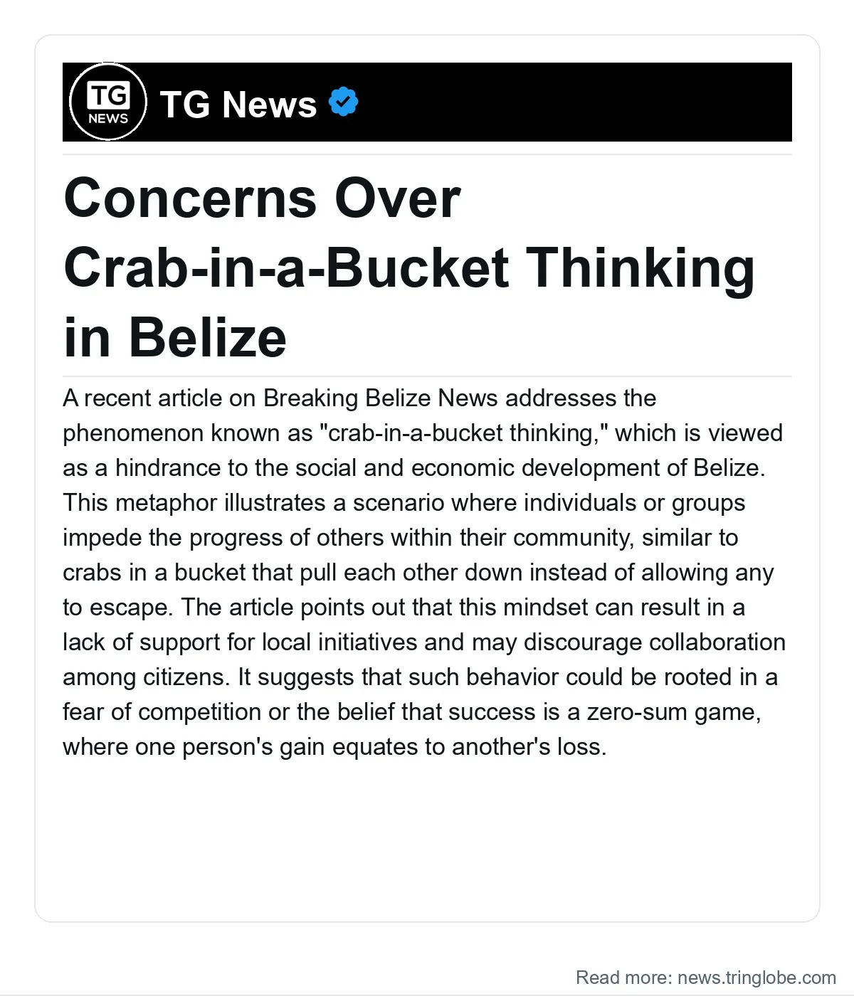 In summary, the article highlights the detrimental effects of crab-in-a-bucket thinking on Belize’s development and calls for a cultural shift towards collaboration and support among community members. It emphasizes that fostering a cooperative environment can lead to greater innovation and economic growth, ultimately benefiting the entire nation.