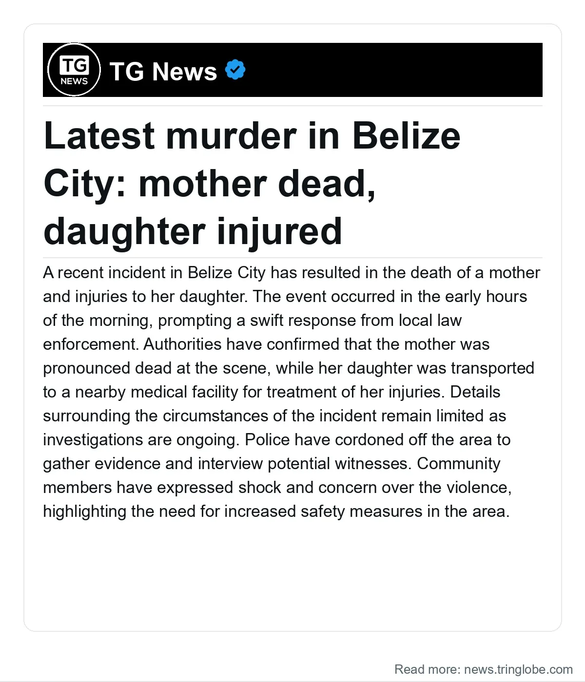 A recent incident in Belize City has resulted in the death of a mother and injuries to her daughter. The event occurred in the early hours of the morning, prompting a swift response from local law enforcement. Authorities have confirmed that the mother was pronounced dead at the scene, while her daughter was transported to a nearby medical facility for treatment of her injuries.