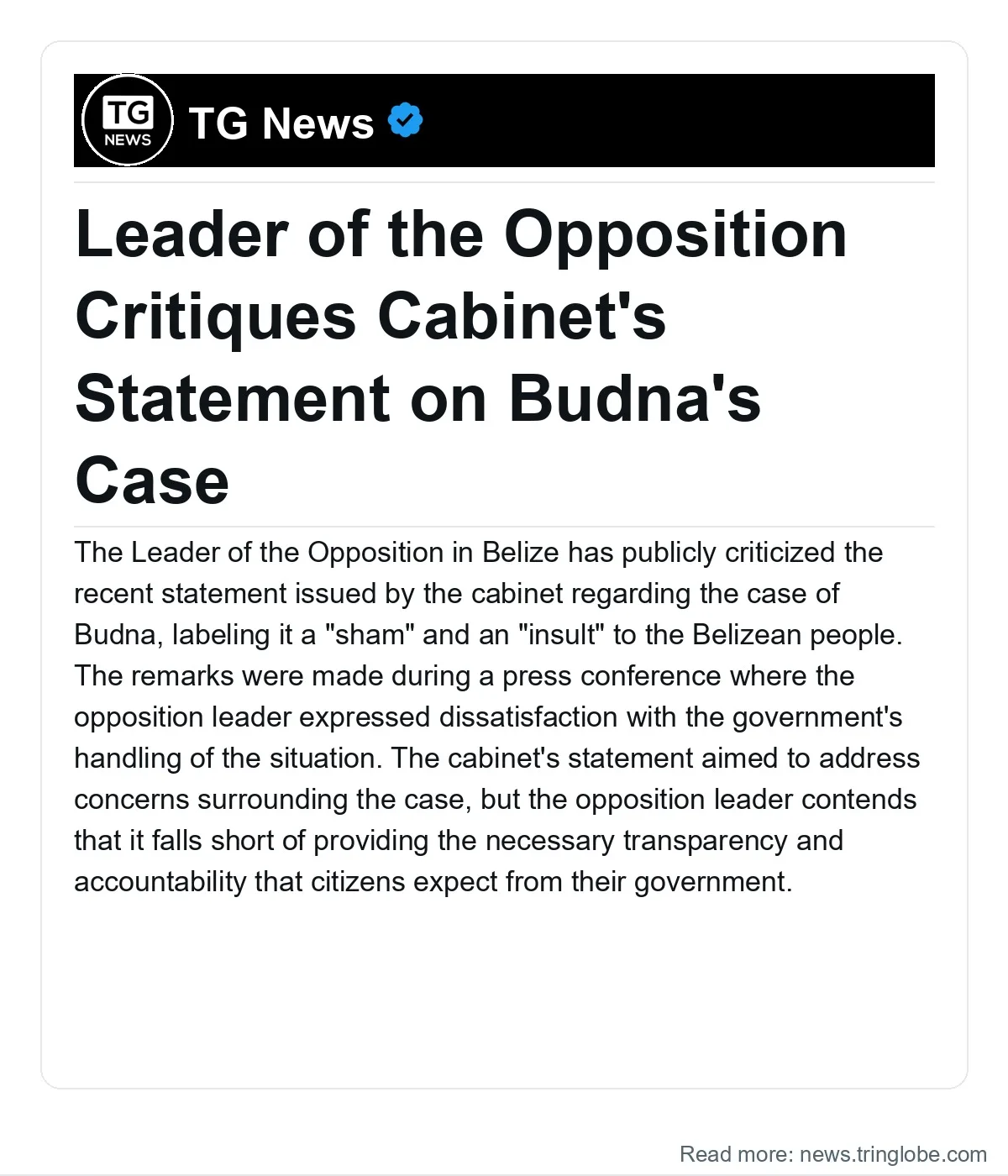The Leader of the Opposition in Belize has publicly criticized the recent statement issued by the cabinet regarding the case of Budna, labeling it a “sham” and an “insult” to the Belizean people. The remarks were made during a press conference where the opposition leader expressed dissatisfaction with the government’s handling of the situation.