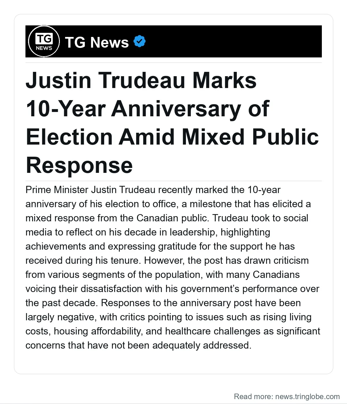 However, the post has drawn criticism from various segments of the population, with many Canadians voicing their dissatisfaction with his government’s performance over the past decade. Responses to the anniversary post have been largely negative, with critics pointing to issues such as rising living costs, housing affordability, and healthcare challenges as significant concerns that have not been adequately addressed.