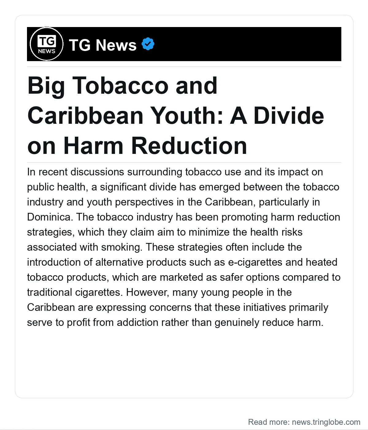 In recent discussions surrounding tobacco use and its impact on public health, a significant divide has emerged between the tobacco industry and youth perspectives in the Caribbean, particularly in Dominica. The tobacco industry has been promoting harm reduction strategies, which they claim aim to minimize the health risks associated with smoking.