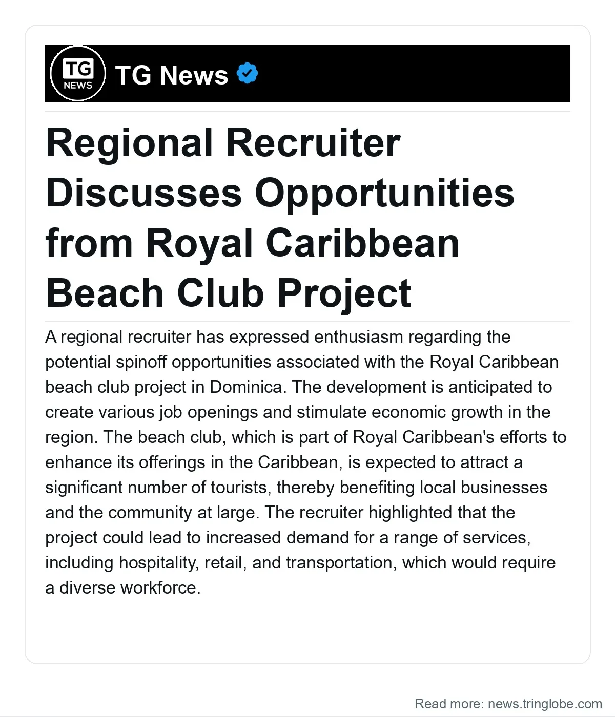 A regional recruiter has expressed enthusiasm regarding the potential spinoff opportunities associated with the Royal Caribbean beach club project in Dominica. The development is anticipated to create various job openings and stimulate economic growth in the region.