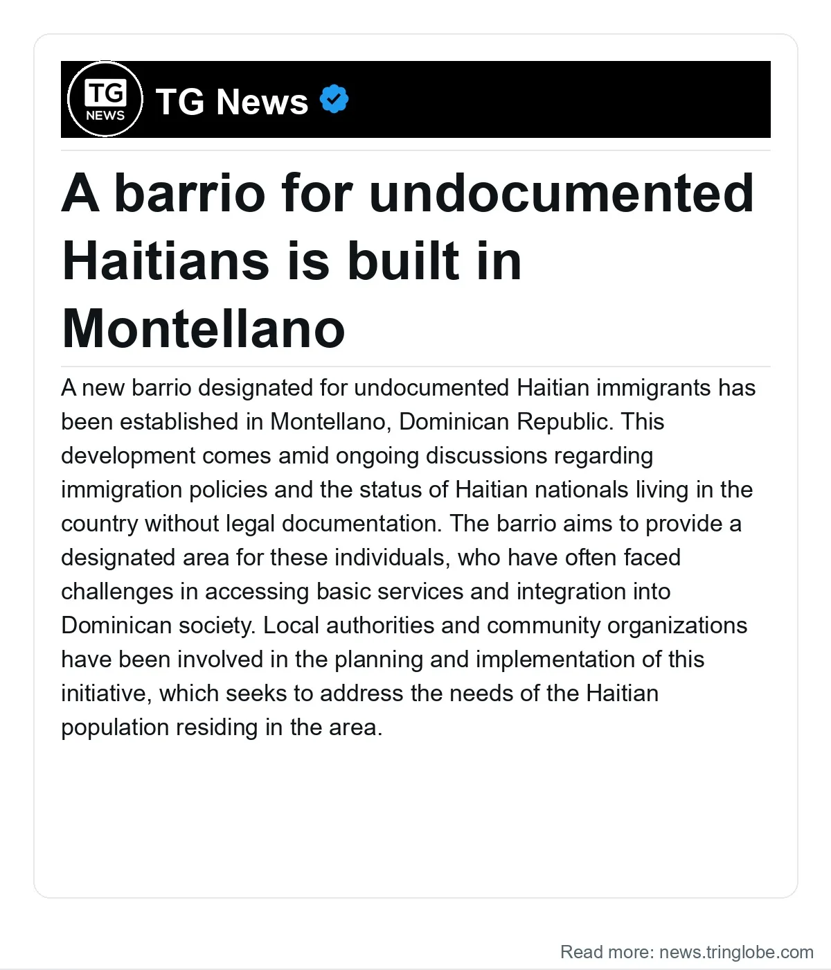 A new barrio designated for undocumented Haitian immigrants has been established in Montellano, Dominican Republic. This development comes amid ongoing discussions regarding immigration policies and the status of Haitian nationals living in the country without legal documentation. The barrio aims to provide a designated area for these individuals, who have often faced challenges in accessing basic services and integration into Dominican society.