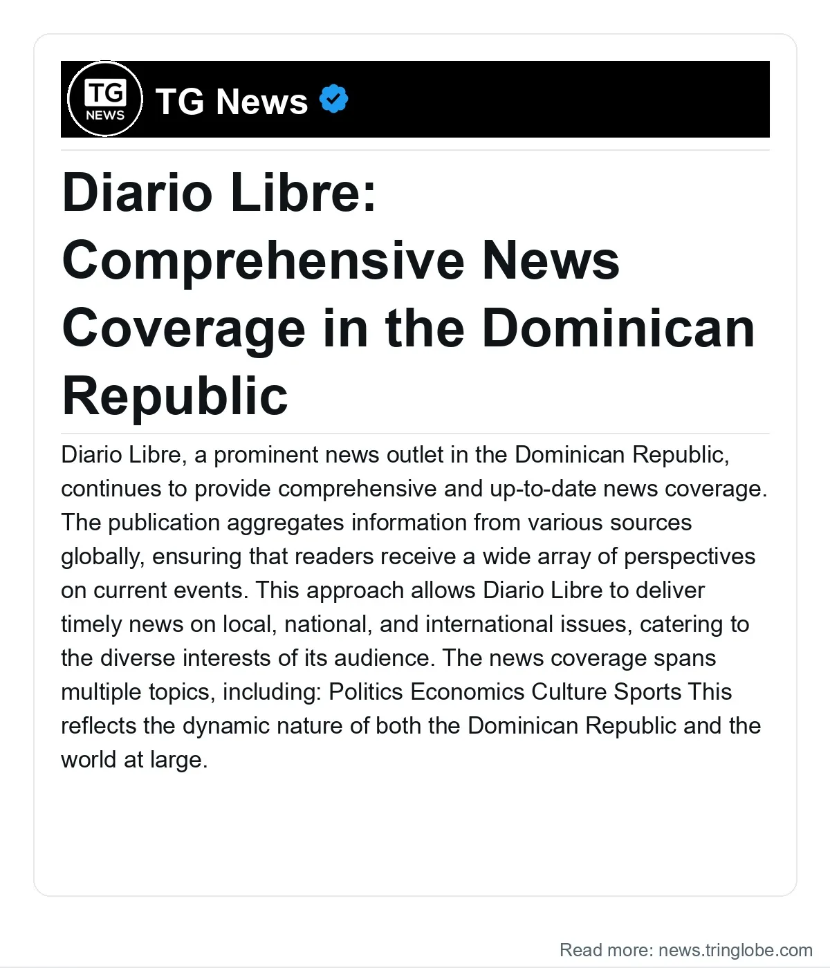 Diario Libre, a prominent news outlet in the Dominican Republic, continues to provide comprehensive and up-to-date news coverage. The publication aggregates information from various sources globally, ensuring that readers receive a wide array of perspectives on current events. This approach allows Diario Libre to deliver timely news on local, national, and international issues, catering to the diverse interests of its audience.