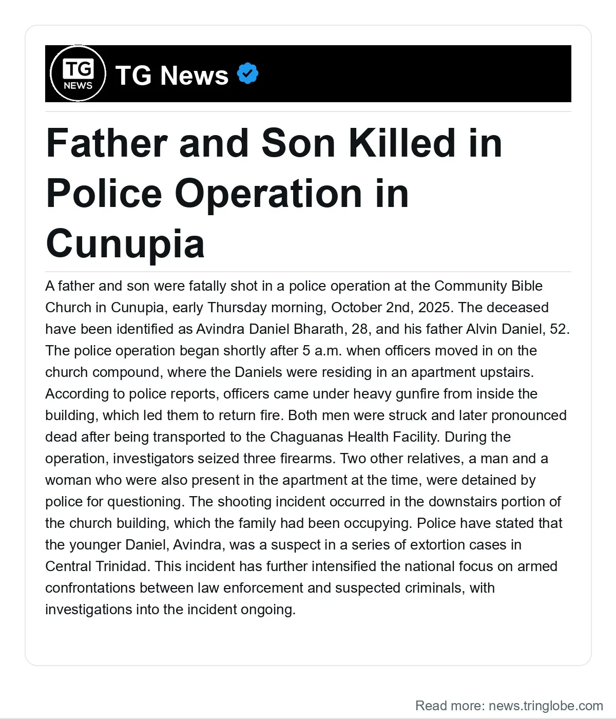 A father and son were fatally shot in a police operation at the Community Bible Church in Cunupia, early Thursday morning, October 2nd, 2025. The deceased have been identified as Avindra Daniel Bharath, 28, and his father Alvin Daniel, 52. The police operation began shortly after 5 a.m. when officers moved in on the church compound, where the Daniels were residing in an apartment upstairs. According to police reports, officers came under heavy gunfire from inside the building, which led them to return fire. Both men were struck and later pronounced dead after being transported to the Chaguanas Health Facility. During the operation, investigators seized three firearms. Two other relatives, a man and a woman who were also present in the apartment at the time, were detained by police for questioning. The shooting incident occurred in the downstairs portion of the church building, which the family had been occupying. Police have stated that the younger Daniel, Avindra, was a suspect in a series of extortion cases in Central Trinidad. This incident has further intensified the national focus on armed confrontations between law enforcement and suspected criminals, with investigations into the incident ongoing.