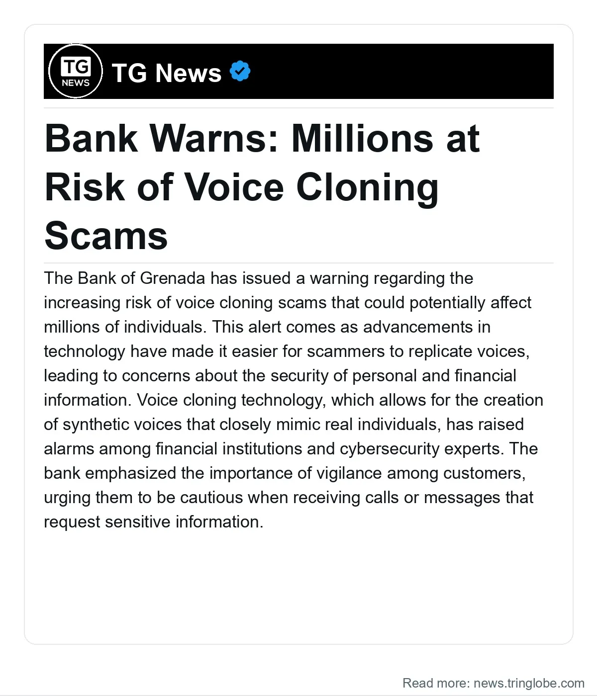 The Bank of Grenada has issued a warning regarding the increasing risk of voice cloning scams that could potentially affect millions of individuals. This alert comes as advancements in technology have made it easier for scammers to replicate voices, leading to concerns about the security of personal and financial information.