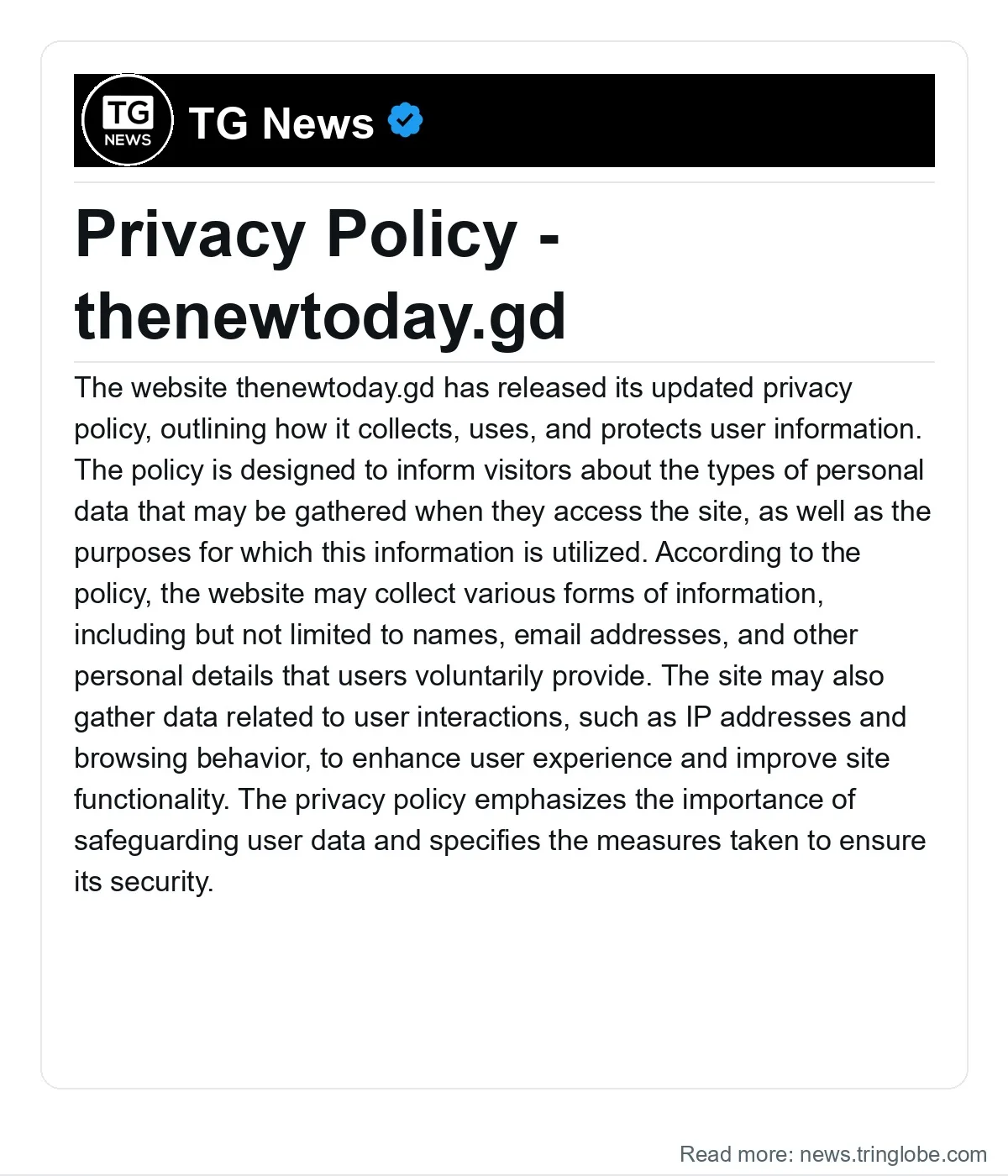 The website thenewtoday.gd has released its updated privacy policy, outlining how it collects, uses, and protects user information. The policy is designed to inform visitors about the types of personal data that may be gathered when they access the site, as well as the purposes for which this information is utilized.