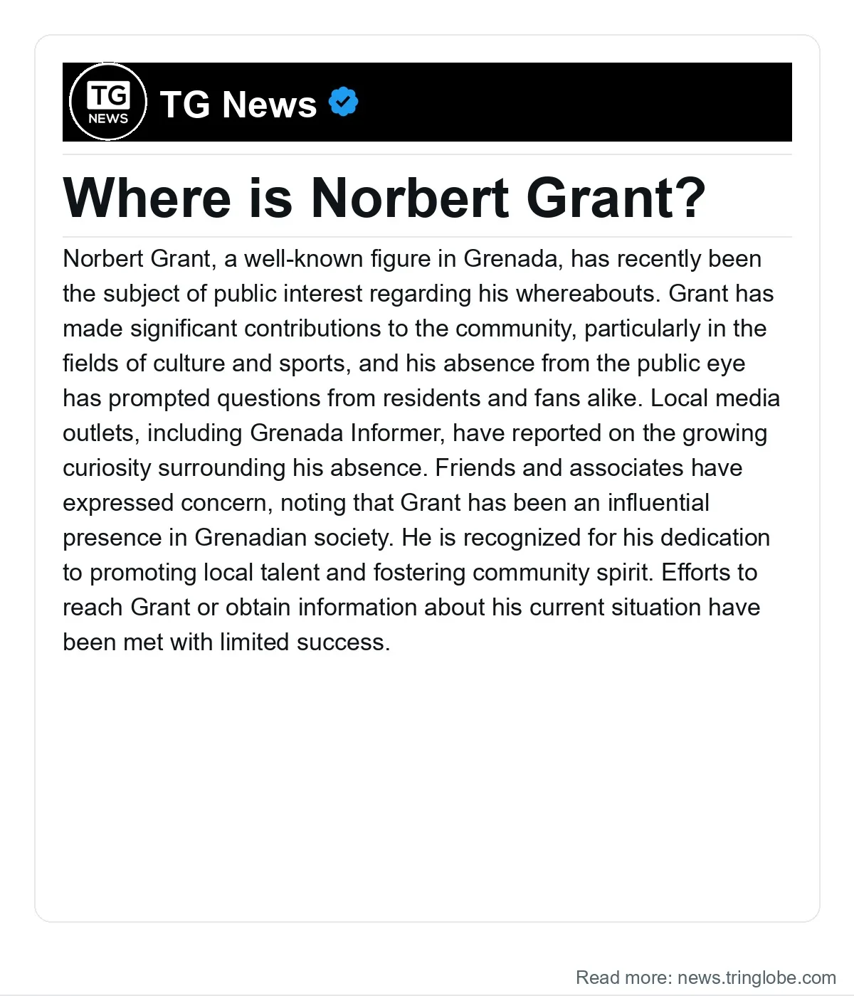 Norbert Grant, a well-known figure in Grenada, has recently been the subject of public interest regarding his whereabouts. Grant has made significant contributions to the community, particularly in the fields of culture and sports, and his absence from the public eye has prompted questions from residents and fans alike.