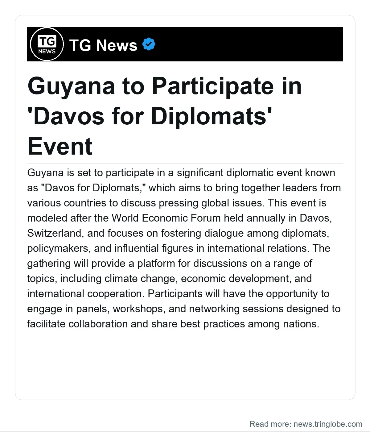 Guyana is set to participate in a significant diplomatic event known as “Davos for Diplomats,” which aims to bring together leaders from various countries to discuss pressing global issues. This event is modeled after the World Economic Forum held annually in Davos, Switzerland, and focuses on fostering dialogue among diplomats, policymakers, and influential figures in international relations.