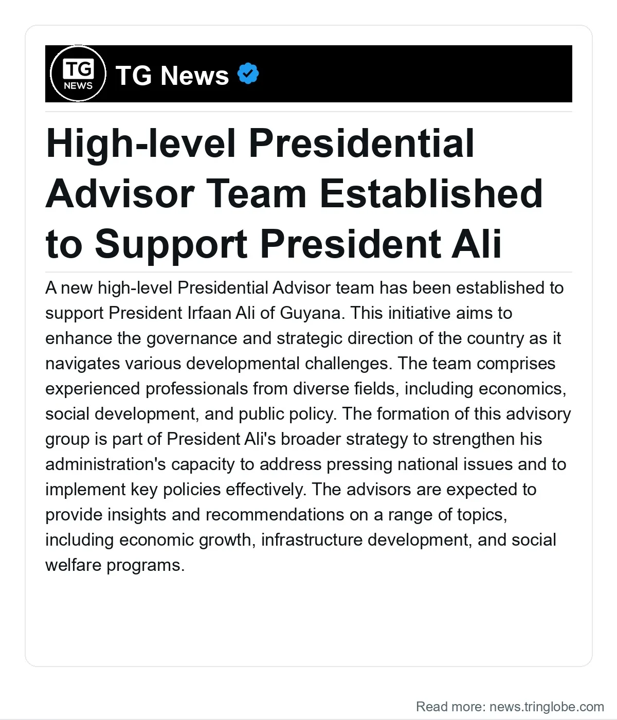 A new high-level Presidential Advisor team has been established to support President Irfaan Ali of Guyana. This initiative aims to enhance the governance and strategic direction of the country as it navigates various developmental challenges. The team comprises experienced professionals from diverse fields, including economics, social development, and public policy.