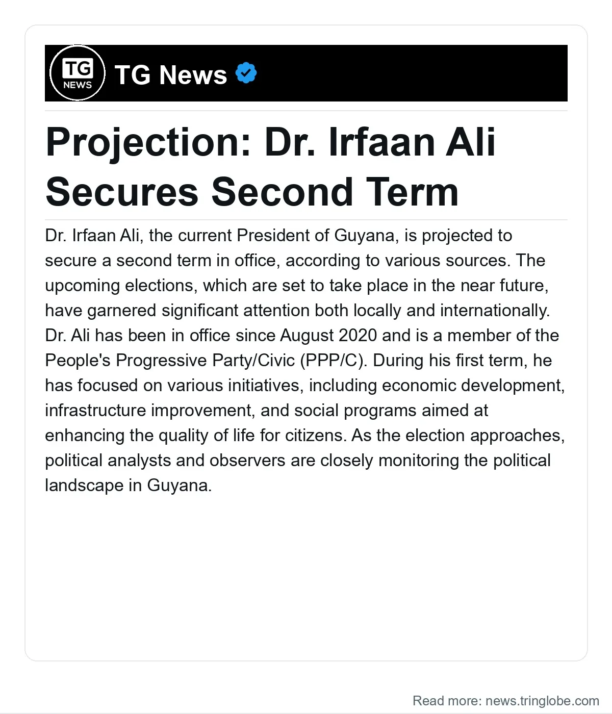 Dr. Irfaan Ali, the current President of Guyana, is projected to secure a second term in office, according to various sources. The upcoming elections, which are set to take place in the near future, have garnered significant attention both locally and internationally.