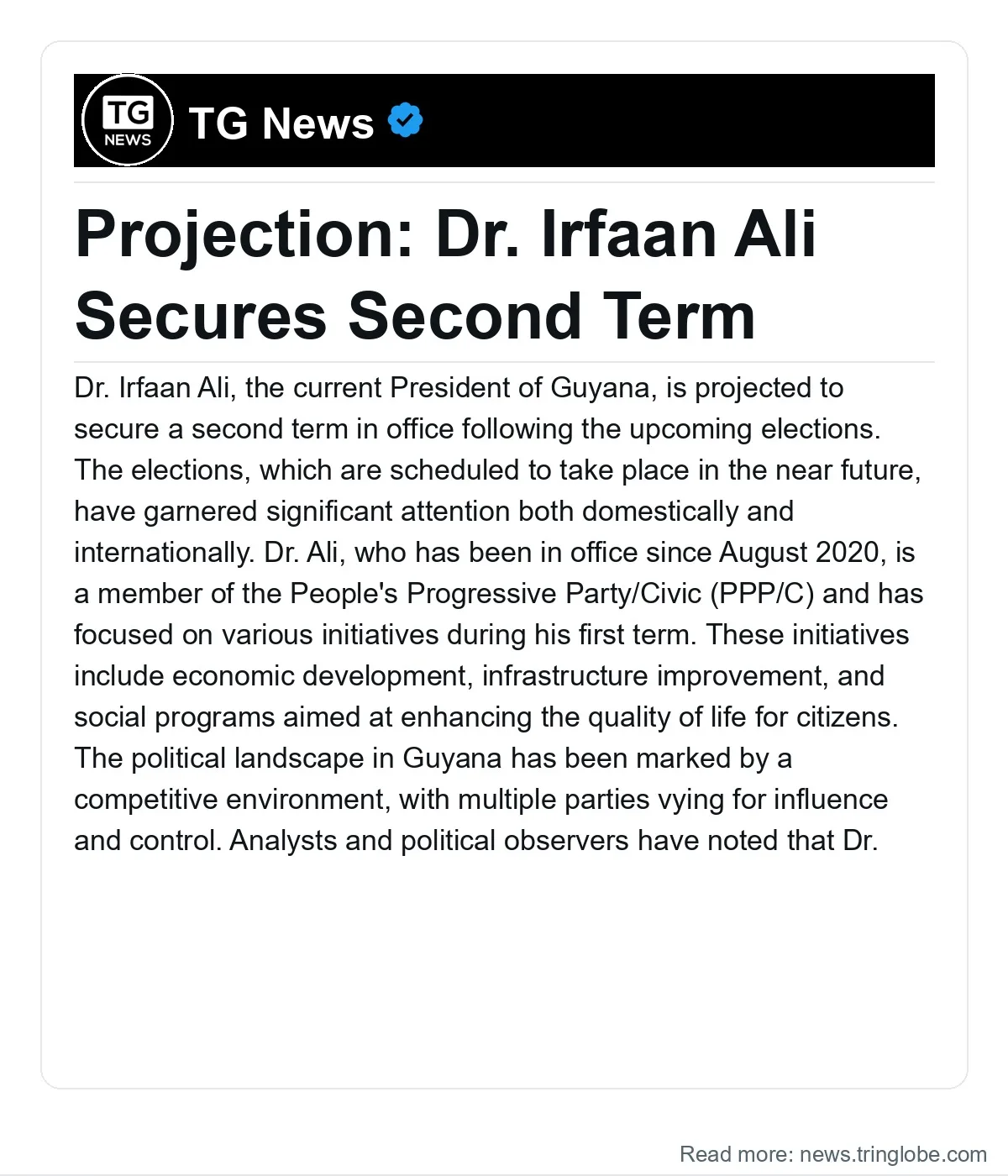 Dr. Irfaan Ali, the current President of Guyana, is projected to secure a second term in office following the upcoming elections. The elections, which are scheduled to take place in the near future, have garnered significant attention both domestically and internationally.