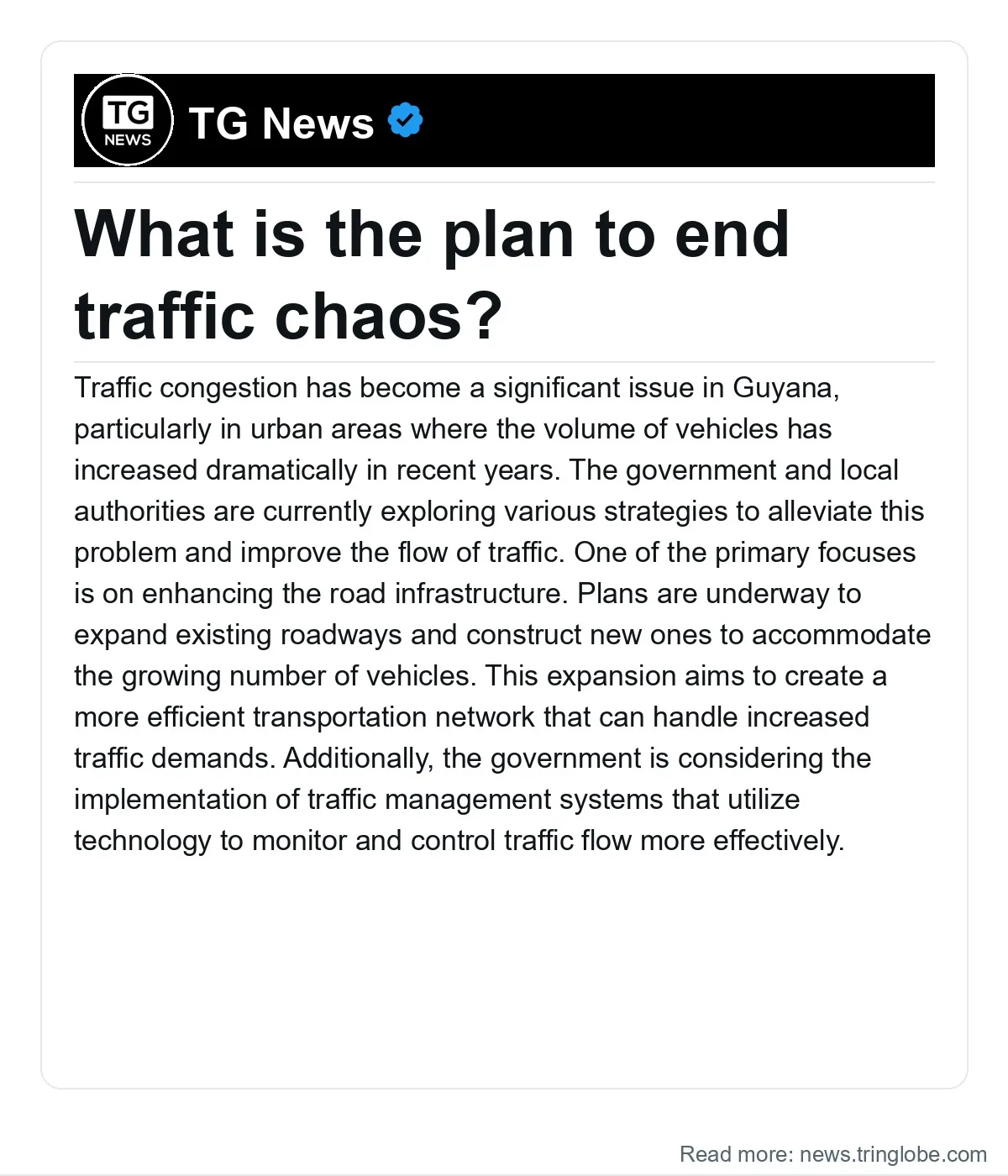 These initiatives reflect a multi-faceted approach to tackling the growing issue of traffic congestion in Guyana’s urban areas. As the government moves forward with these plans, the effectiveness of these strategies will be closely monitored to ensure they meet the needs of the population and improve overall traffic conditions.