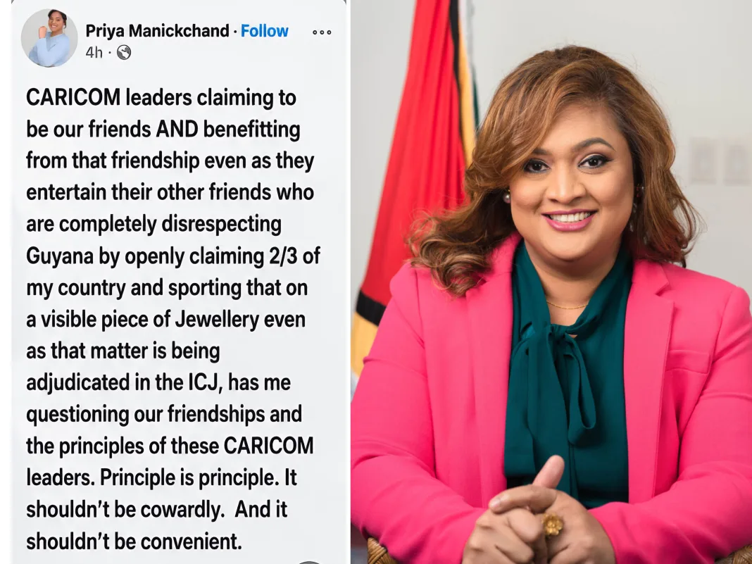 Manickchand accused CARICOM leaders of profiting from their relationship with Guyana, while simultaneously providing a platform to Venezuela. She views this as an act of disrespect towards Guyana’s sovereignty. In a strongly worded statement, she asserted that principles should not be ‘cowardly’ or merely ‘convenient’.