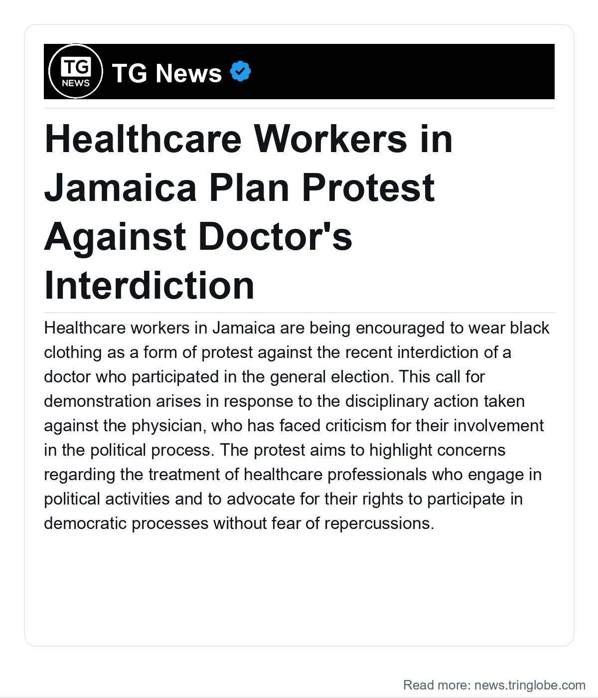 Healthcare workers in Jamaica are being encouraged to wear black clothing as a form of protest against the recent interdiction of a doctor who participated in the general election. This call for demonstration arises in response to the disciplinary action taken against the physician, who has faced criticism for their involvement in the political process.