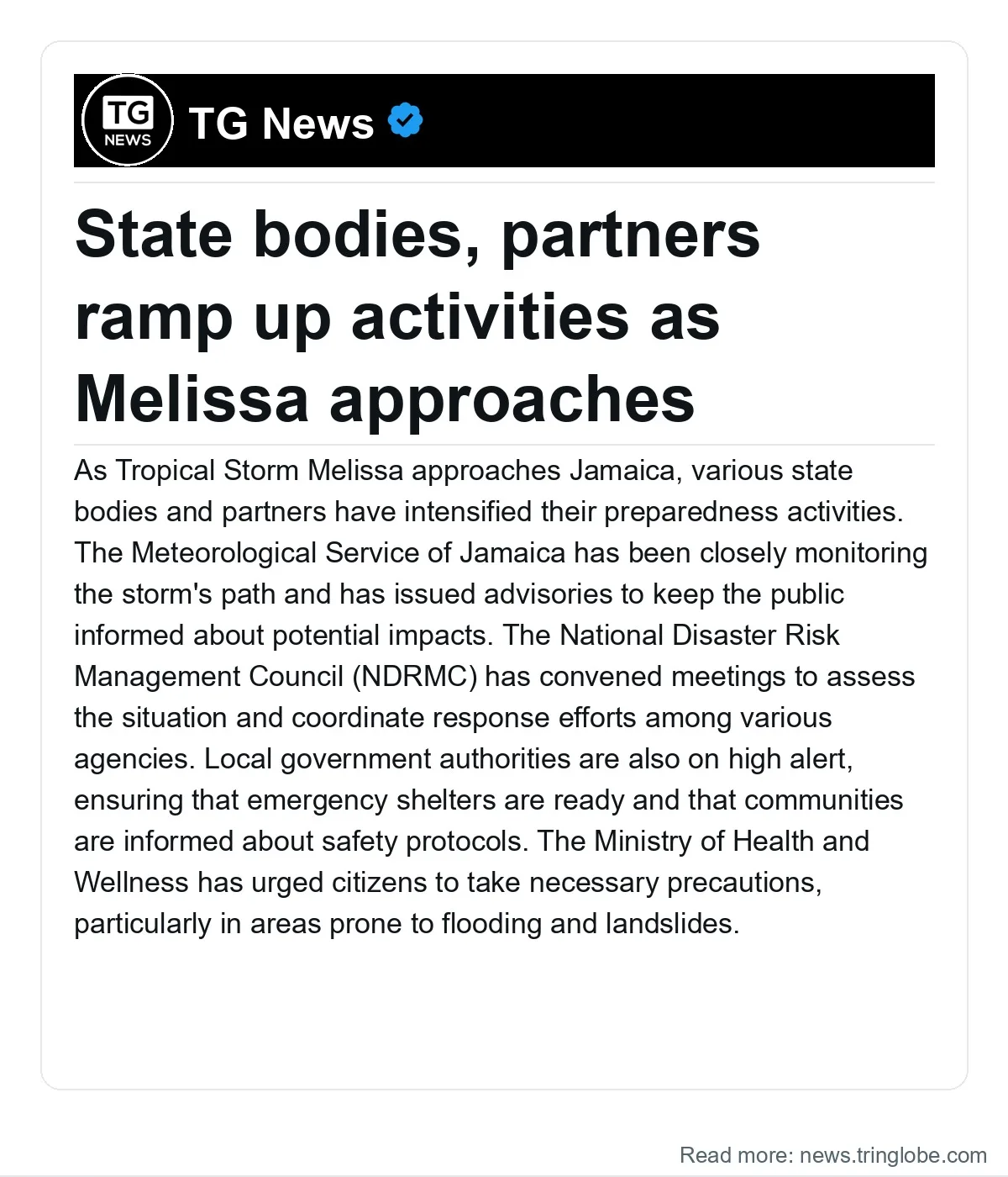 In summary, as Tropical Storm Melissa approaches, various state bodies and partners in Jamaica are ramping up their preparedness activities to ensure the safety and well-being of residents. The public is advised to stay informed and to take the necessary precautions to protect themselves and their property.