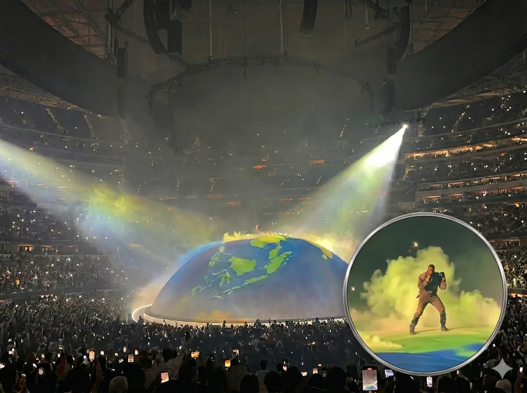 Performing atop a massive globe-shaped stage, Ye captivated the audience with his hit “Can’t Tell Me Nothing,” backed by dramatic lighting, smoke effects, and an immersive arena setup. The unique staging gave the illusion of him standing on the world, adding to the powerful visual impact of the moment.
