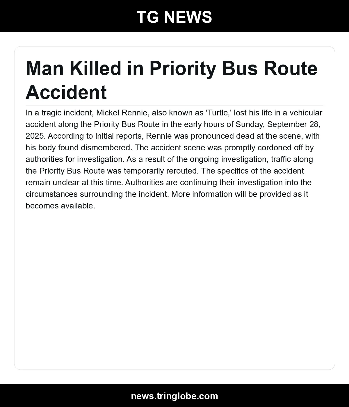 In a tragic incident, Mickel Rennie, also known as ‘Turtle,’ lost his life in a vehicular accident along the Priority Bus Route in the early hours of Sunday, September 28, 2025. According to initial reports, Rennie was pronounced dead at the scene, with his body found dismembered. The accident scene was promptly cordoned off by authorities for investigation. As a result of the ongoing investigation, traffic along the Priority Bus Route was temporarily rerouted. The specifics of the accident remain unclear at this time. Authorities are continuing their investigation into the circumstances surrounding the incident. More information will be provided as it becomes available.