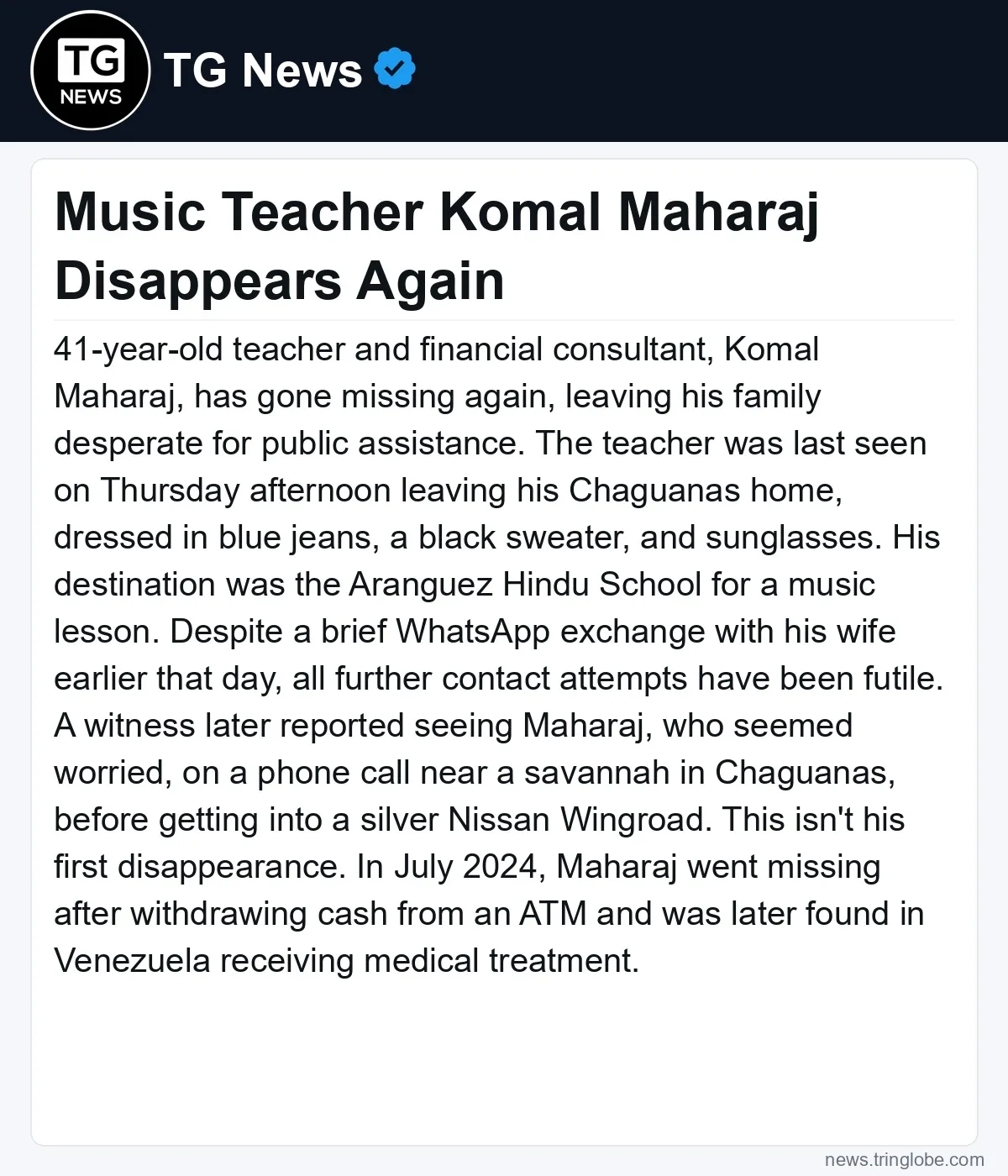 41-year-old teacher and financial consultant, Komal Maharaj, has gone missing again, leaving his family desperate for public assistance. The teacher was last seen on Thursday afternoon leaving his Chaguanas home, dressed in blue jeans, a black sweater, and sunglasses. His destination was the Aranguez Hindu School for a music lesson. Despite a brief WhatsApp exchange with his wife earlier that day, all further contact attempts have been futile. A witness later reported seeing Maharaj, who seemed worried, on a phone call near a savannah in Chaguanas, before getting into a silver Nissan Wingroad. This isn’t his first disappearance. In July 2024, Maharaj went missing after withdrawing cash from an ATM and was later found in Venezuela receiving medical treatment.