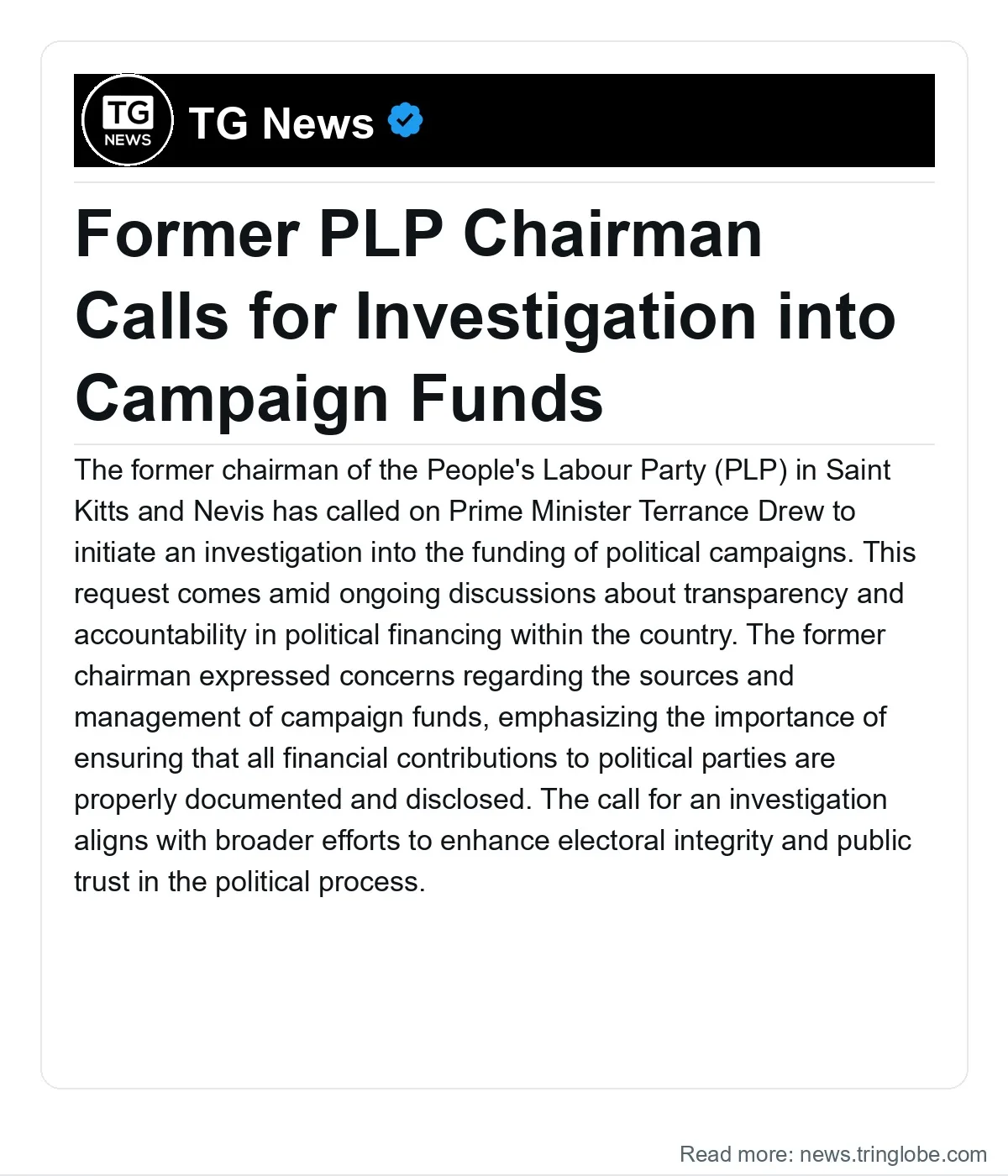 The former chairman of the People’s Labour Party (PLP) in Saint Kitts and Nevis has called on Prime Minister Terrance Drew to initiate an investigation into the funding of political campaigns. This request comes amid ongoing discussions about transparency and accountability in political financing within the country.