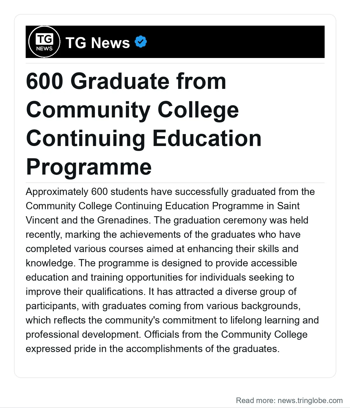 In conclusion, the successful graduation of approximately 600 students from the Community College Continuing Education Programme highlights the importance of accessible education in Saint Vincent and the Grenadines. The programme not only supports individual growth but also contributes to the broader economic development of the region.
