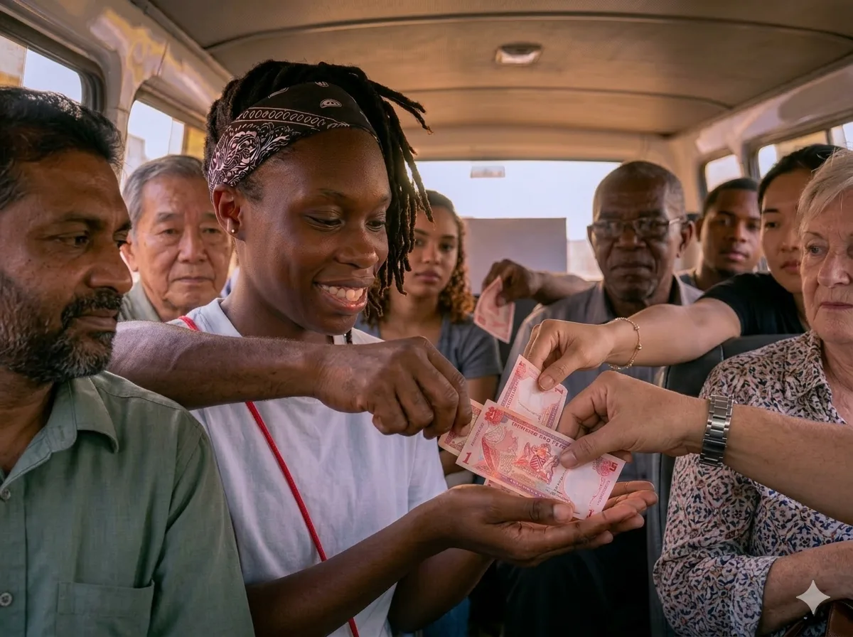 The same woman who suggested asking the driver offered her two dollars. Another passenger handed her three dollars, and someone seated toward the back of the maxi contributed two more.