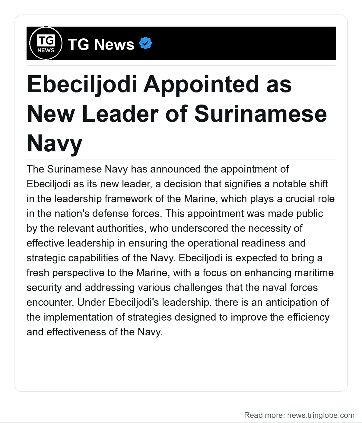 The Surinamese Navy has announced the appointment of Ebeciljodi as its new leader, a decision that signifies a notable shift in the leadership framework of the Marine, which plays a crucial role in the nation’s defense forces.