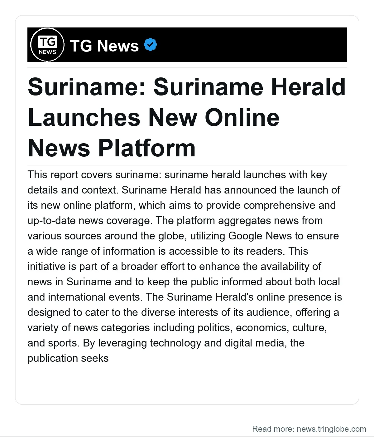 Suriname Herald has announced the launch of its new online platform, which aims to provide comprehensive and up-to-date news coverage. The platform aggregates news from various sources around the globe, utilizing Google News to ensure a wide range of information is accessible to its readers. This initiative is part of a broader effort to enhance the availability of news in Suriname and to keep the public informed about both local and international events.