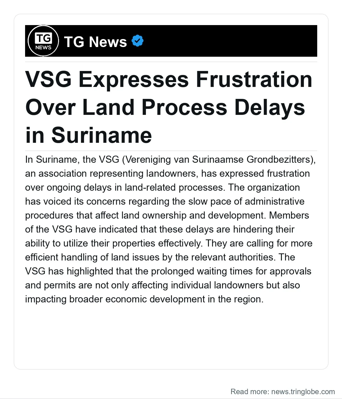 In Suriname, the VSG (Vereniging van Surinaamse Grondbezitters), an association representing landowners, has expressed frustration over ongoing delays in land-related processes. The organization has voiced its concerns regarding the slow pace of administrative procedures that affect land ownership and development.
