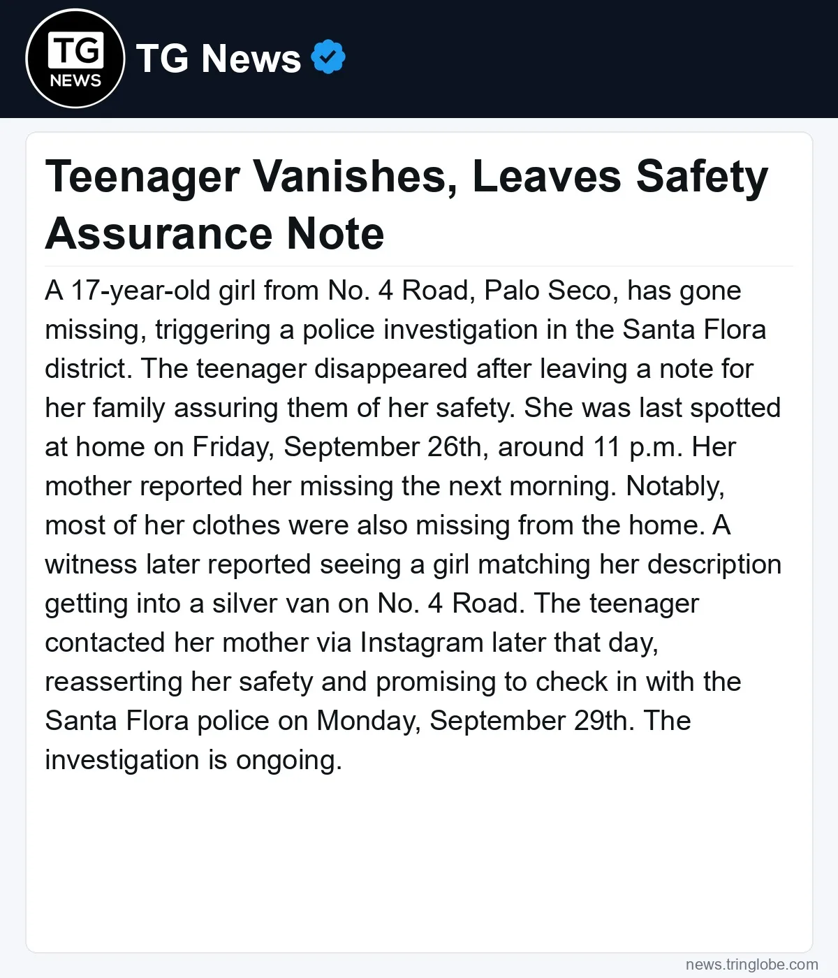 A 17-year-old girl from No. 4 Road, Palo Seco, has gone missing, triggering a police investigation in the Santa Flora district. The teenager disappeared after leaving a note for her family assuring them of her safety. She was last spotted at home on Friday, September 26th, around 11 p.m. Her mother reported her missing the next morning. Notably, most of her clothes were also missing from the home. A witness later reported seeing a girl matching her description getting into a silver van on No. 4 Road. The teenager contacted her mother via Instagram later that day, reasserting her safety and promising to check in with the Santa Flora police on Monday, September 29th. The investigation is ongoing.