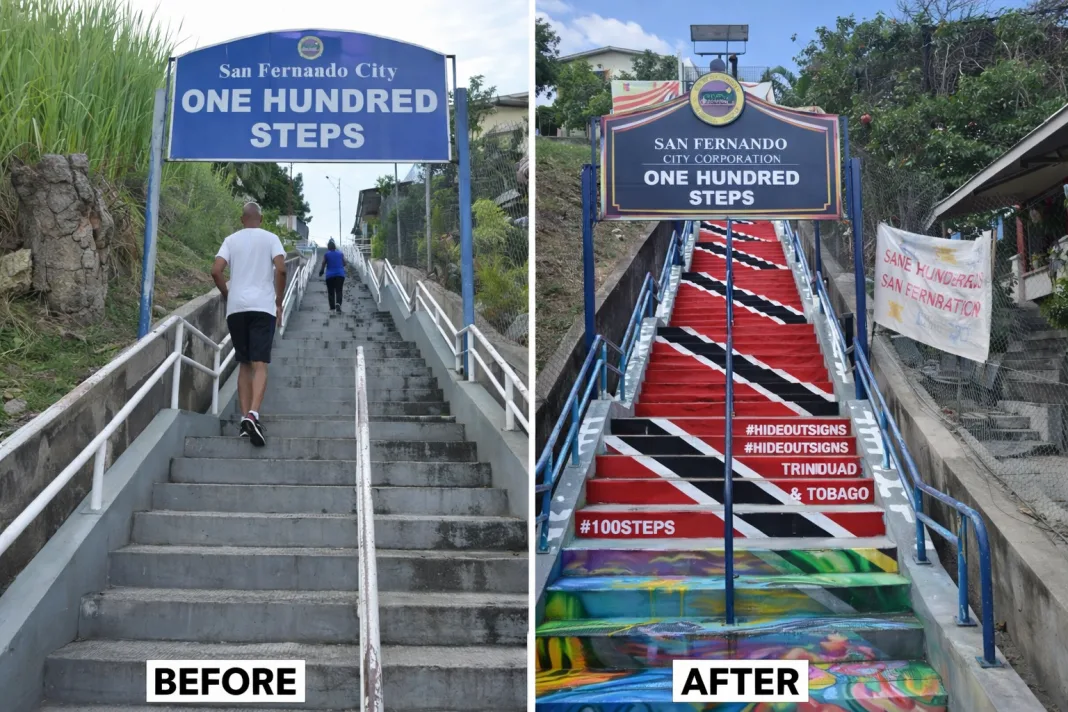 San Fernando’s iconic One Hundred Steps has experienced a remarkable transformation. What was once a plain, concrete staircase used daily by residents for exercise and access between communities, has now turned into a vibrant national landmark. Its stark aesthetic, previously marred by signs of wear and minimal visual appeal, has been replaced with a bold and lively redesign.