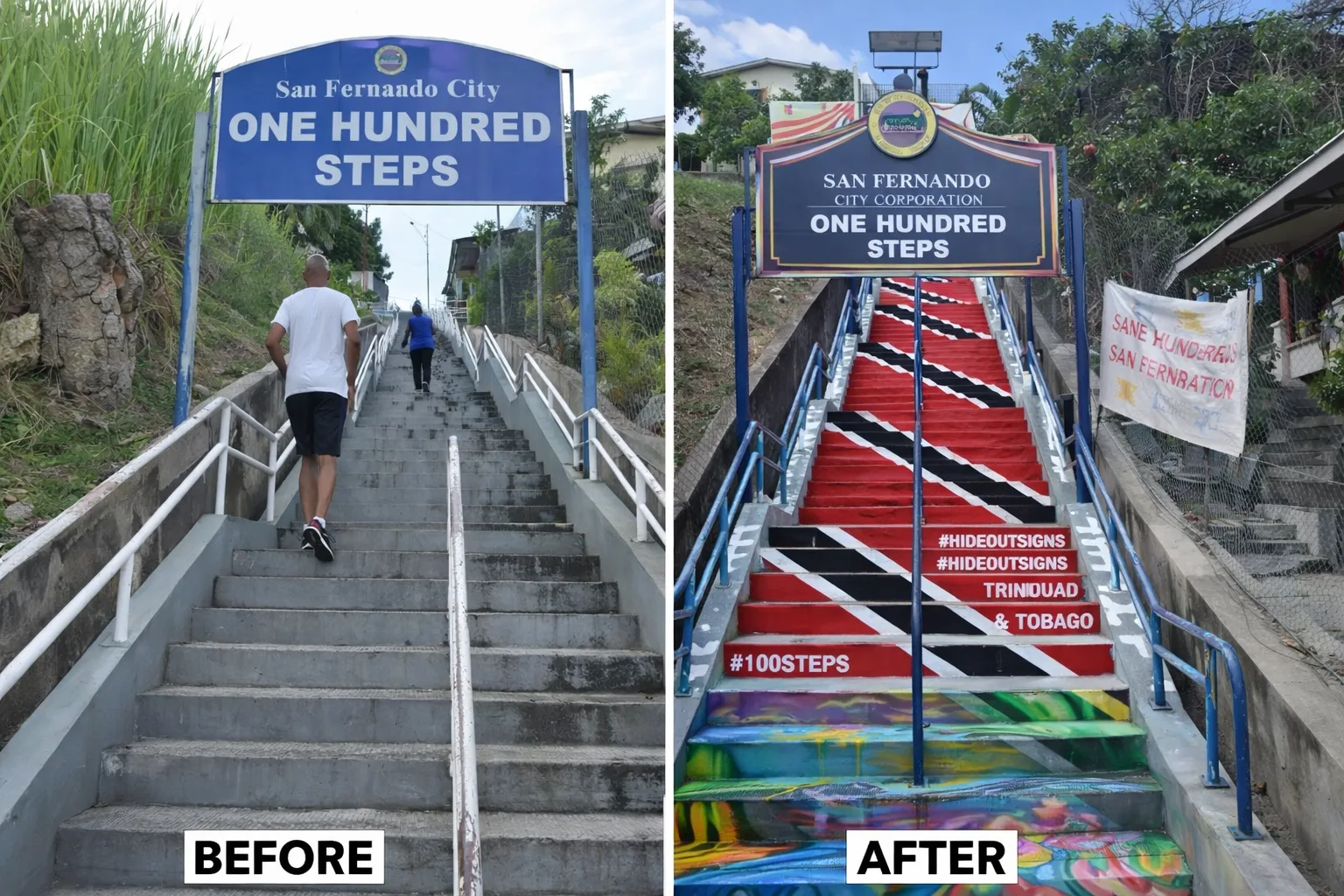 San Fernando’s iconic One Hundred Steps has experienced a remarkable transformation. What was once a plain, concrete staircase used daily by residents for exercise and access between communities, has now turned into a vibrant national landmark. Its stark aesthetic, previously marred by signs of wear and minimal visual appeal, has been replaced with a bold and lively redesign.