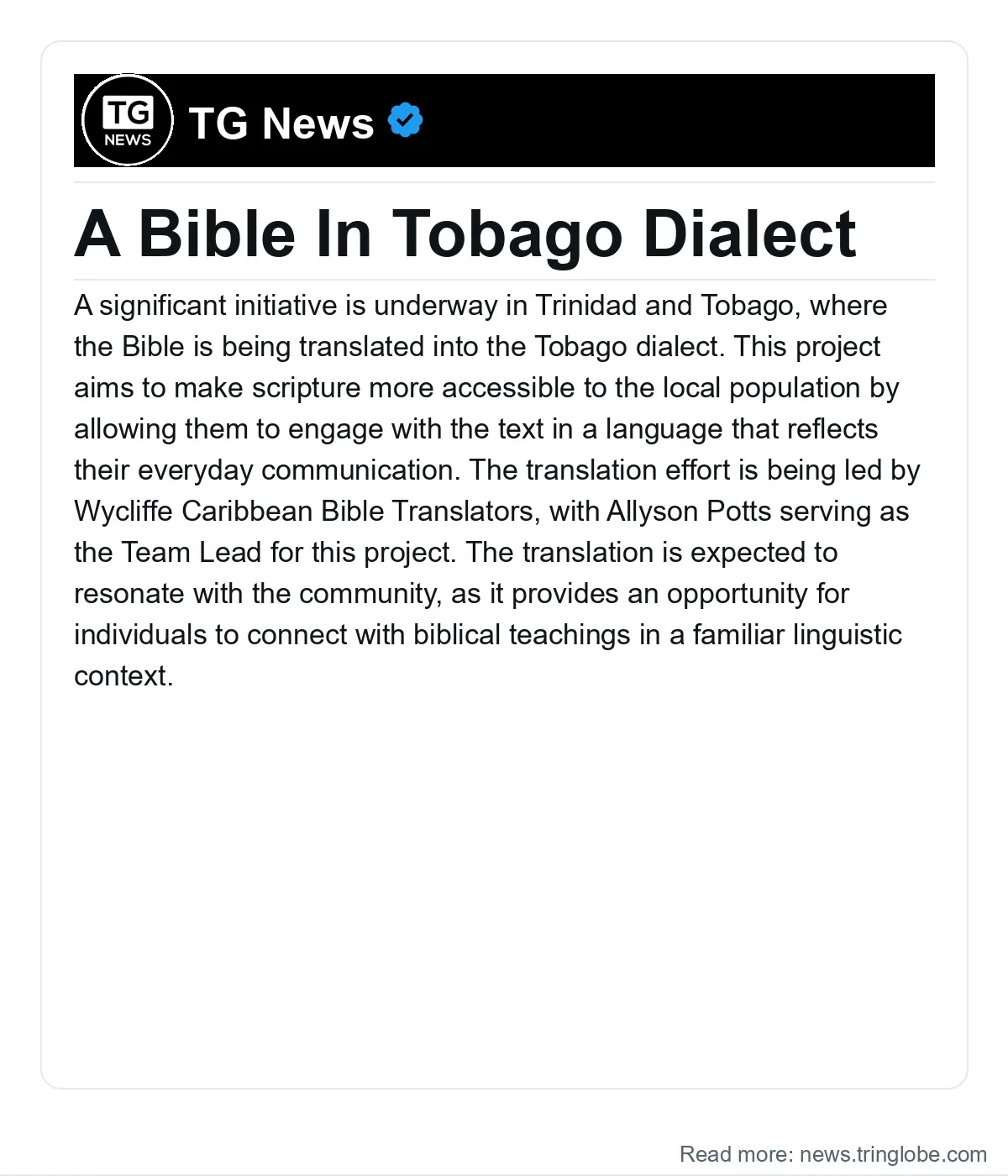 This initiative is part of a broader movement to promote the use of local dialects in religious texts, which can enhance understanding and foster a deeper spiritual connection among speakers of the dialect. In an interview, Potts emphasized the importance of this translation for the Tobago community, highlighting that it allows for a more personal and relatable experience of the scriptures.