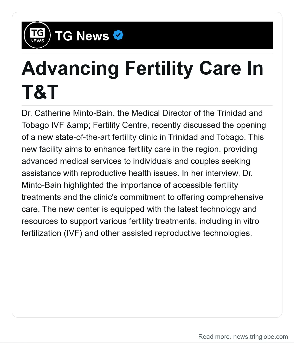 Dr. Catherine Minto-Bain, the Medical Director of the Trinidad and Tobago IVF & Fertility Centre, recently discussed the opening of a new state-of-the-art fertility clinic in Trinidad and Tobago. This new facility aims to enhance fertility care in the region, providing advanced medical services to individuals and couples seeking assistance with reproductive health issues.