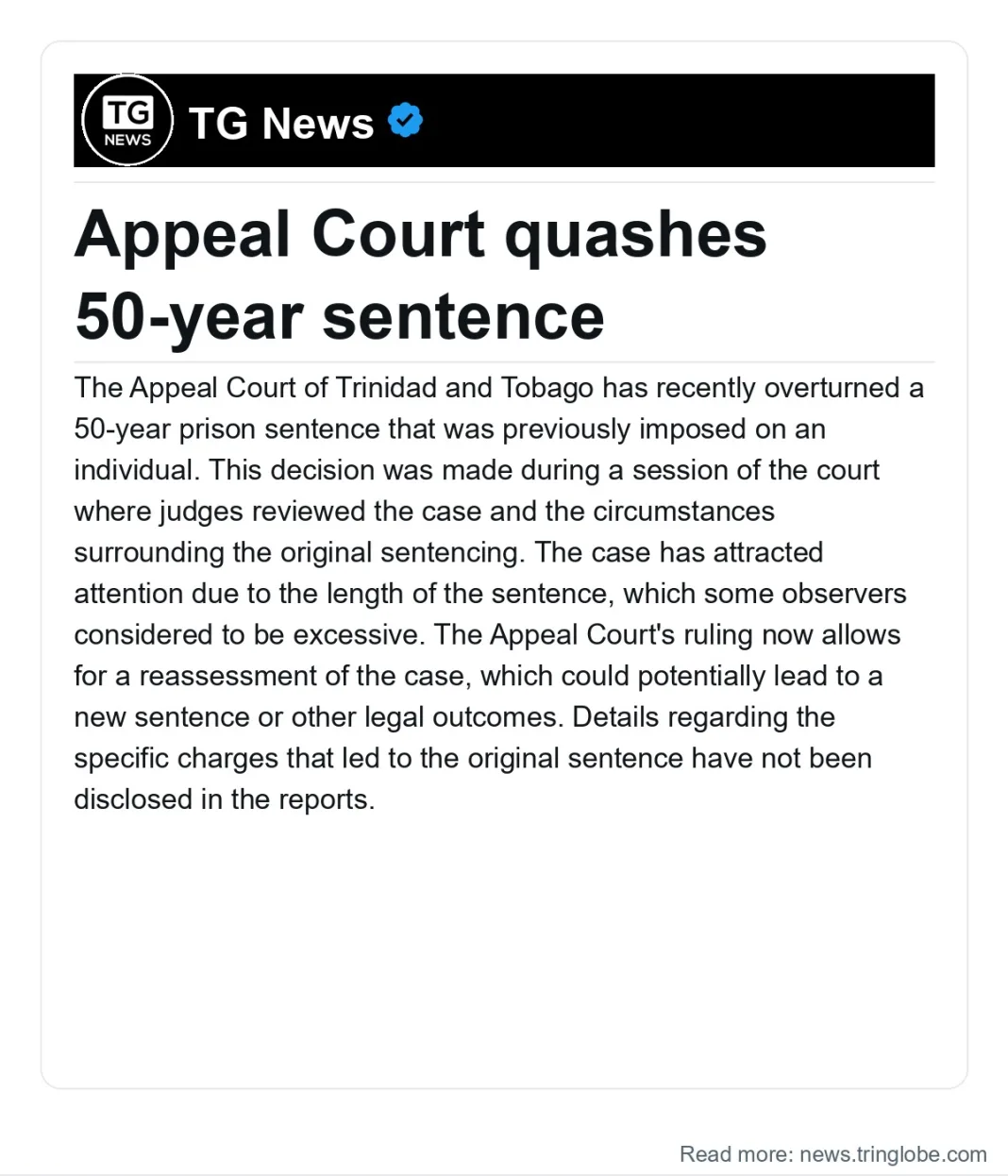 The Appeal Court of Trinidad and Tobago has recently overturned a 50-year prison sentence that was previously imposed on an individual. This decision was made during a session of the court where judges reviewed the case and the circumstances surrounding the original sentencing.