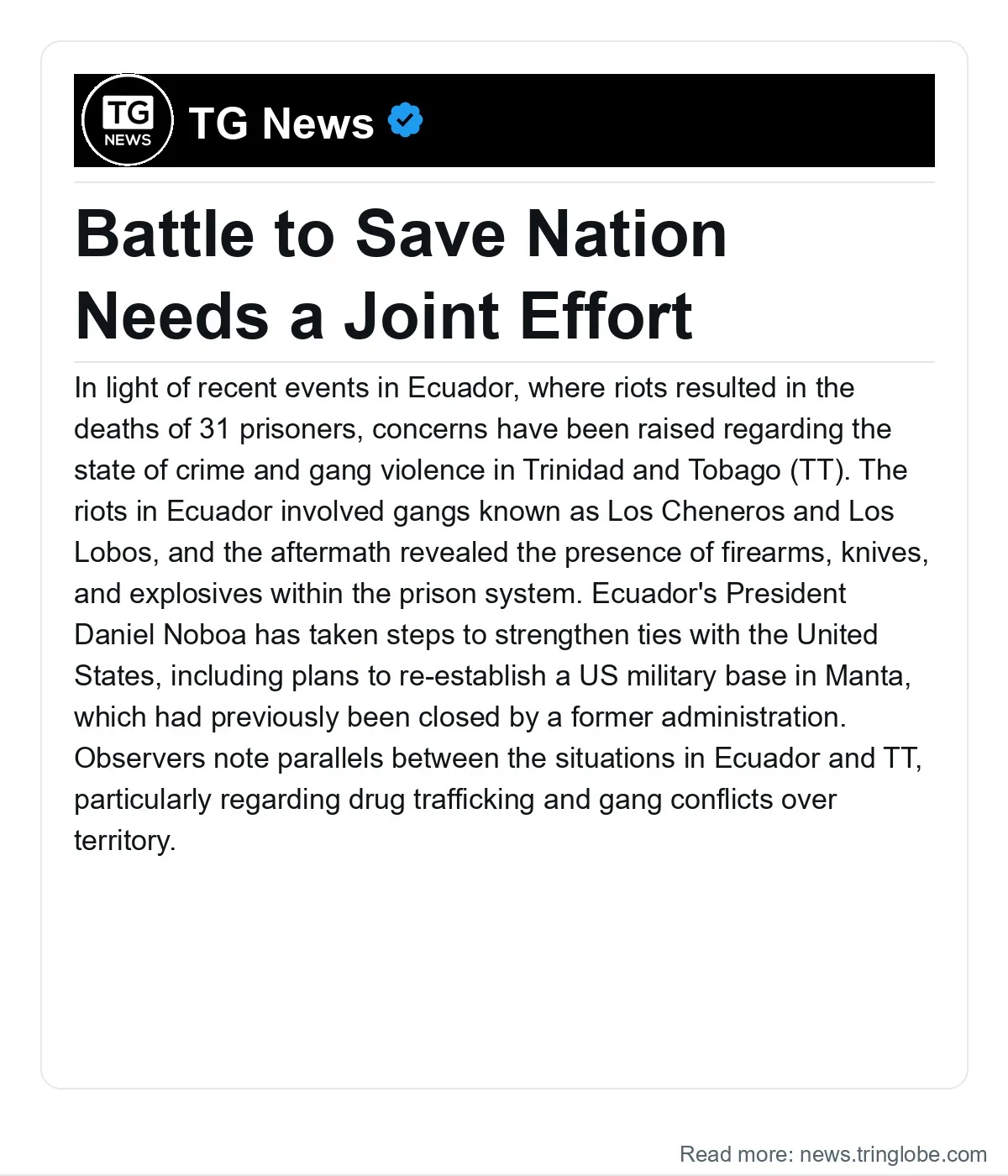 Ecuador’s President Daniel Noboa has taken steps to strengthen ties with the United States, including plans to re-establish a US military base in Manta, which had previously been closed by a former administration. Observers note parallels between the situations in Ecuador and TT, particularly regarding drug trafficking and gang conflicts over territory.