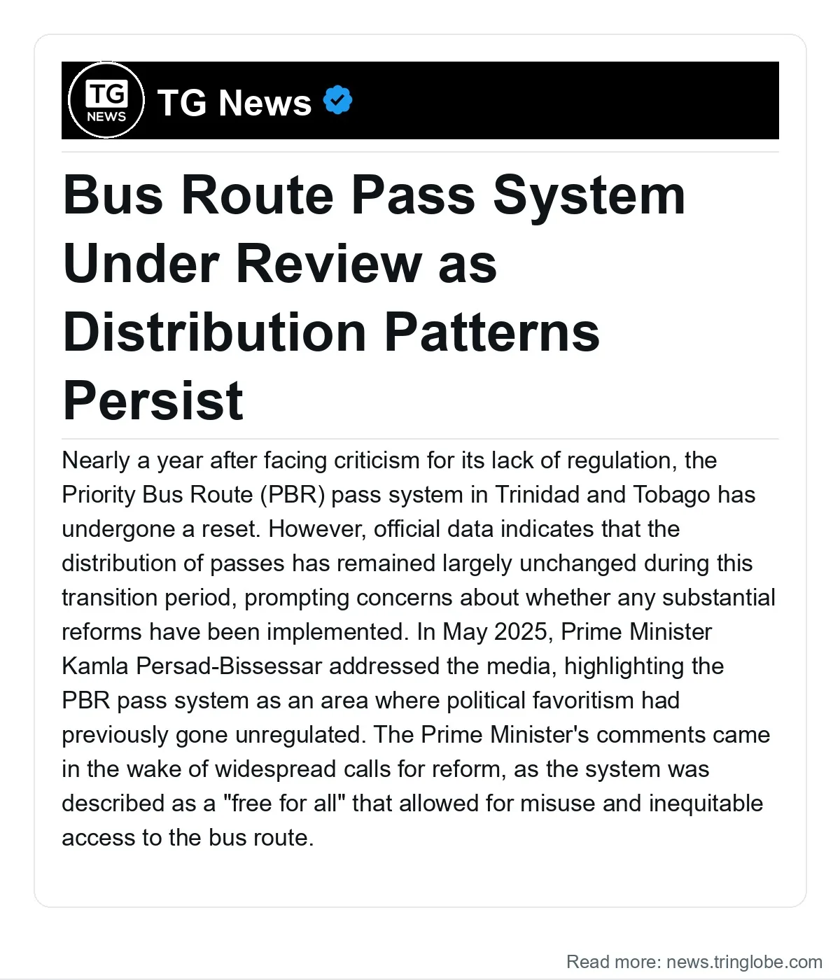 In May 2025, Prime Minister Kamla Persad-Bissessar addressed the media, highlighting the PBR pass system as an area where political favoritism had previously gone unregulated. The Prime Minister’s comments came in the wake of widespread calls for reform, as the system was described as a “free for all” that allowed for misuse and inequitable access to the bus route.