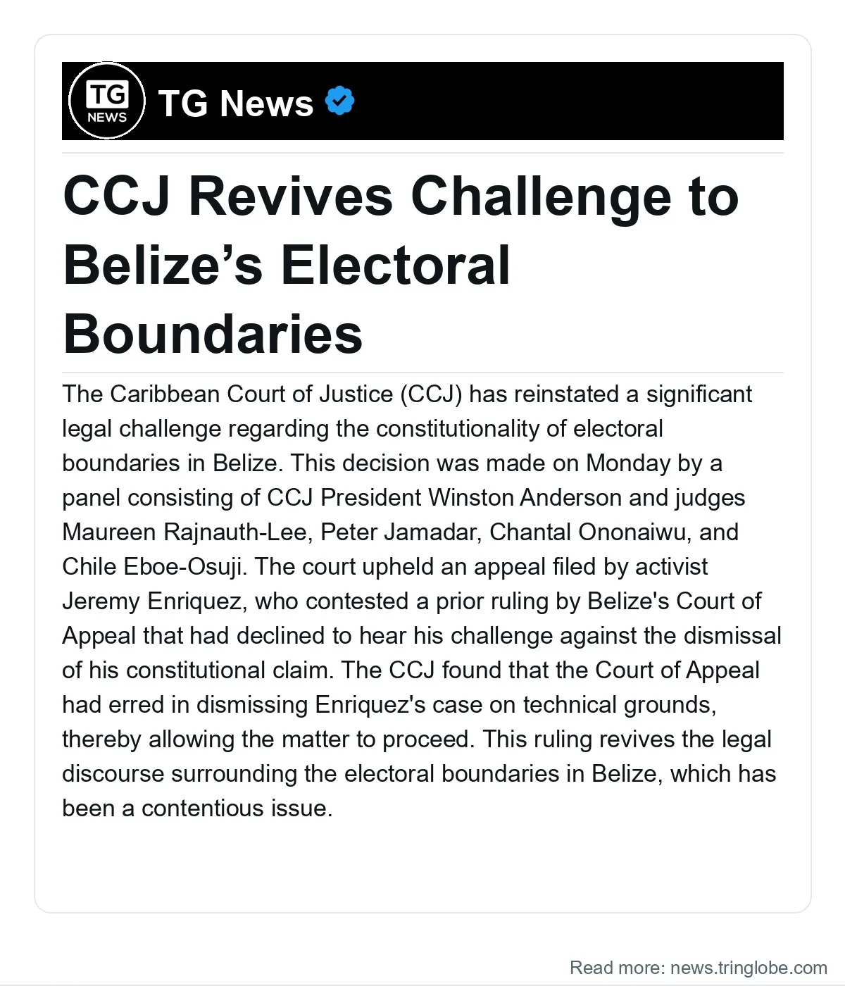 The Caribbean Court of Justice (CCJ) has reinstated a significant legal challenge regarding the constitutionality of electoral boundaries in Belize. This decision was made on Monday by a panel consisting of CCJ President Winston Anderson and judges Maureen Rajnauth-Lee, Peter Jamadar, Chantal Ononaiwu, and Chile Eboe-Osuji.