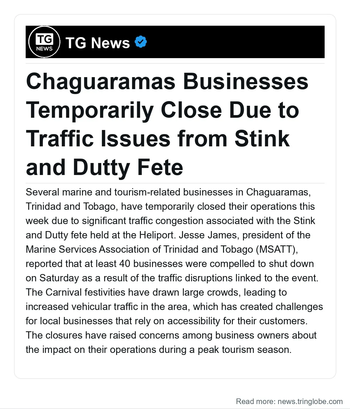 Several marine and tourism-related businesses in Chaguaramas, Trinidad and Tobago, have temporarily closed their operations this week due to significant traffic congestion associated with the Stink and Dutty fete held at the Heliport. Jesse James, president of the Marine Services Association of Trinidad and Tobago (MSATT), reported that at least 40 businesses were compelled to shut down on Saturday as a result of the traffic disruptions linked to the event.