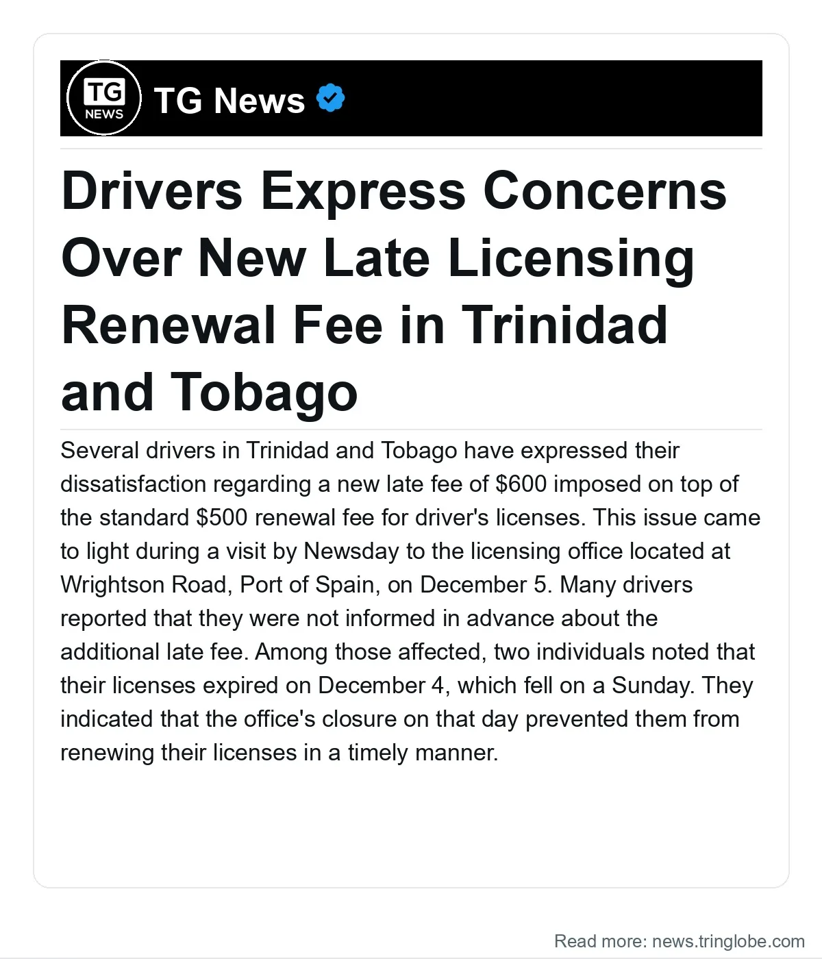 Several drivers in Trinidad and Tobago have expressed their dissatisfaction regarding a new late fee of $600 imposed on top of the standard $500 renewal fee for driver’s licenses. This issue came to light during a visit by Newsday to the licensing office located at Wrightson Road, Port of Spain, on December 5. Many drivers reported that they were not informed in advance about the additional late fee.