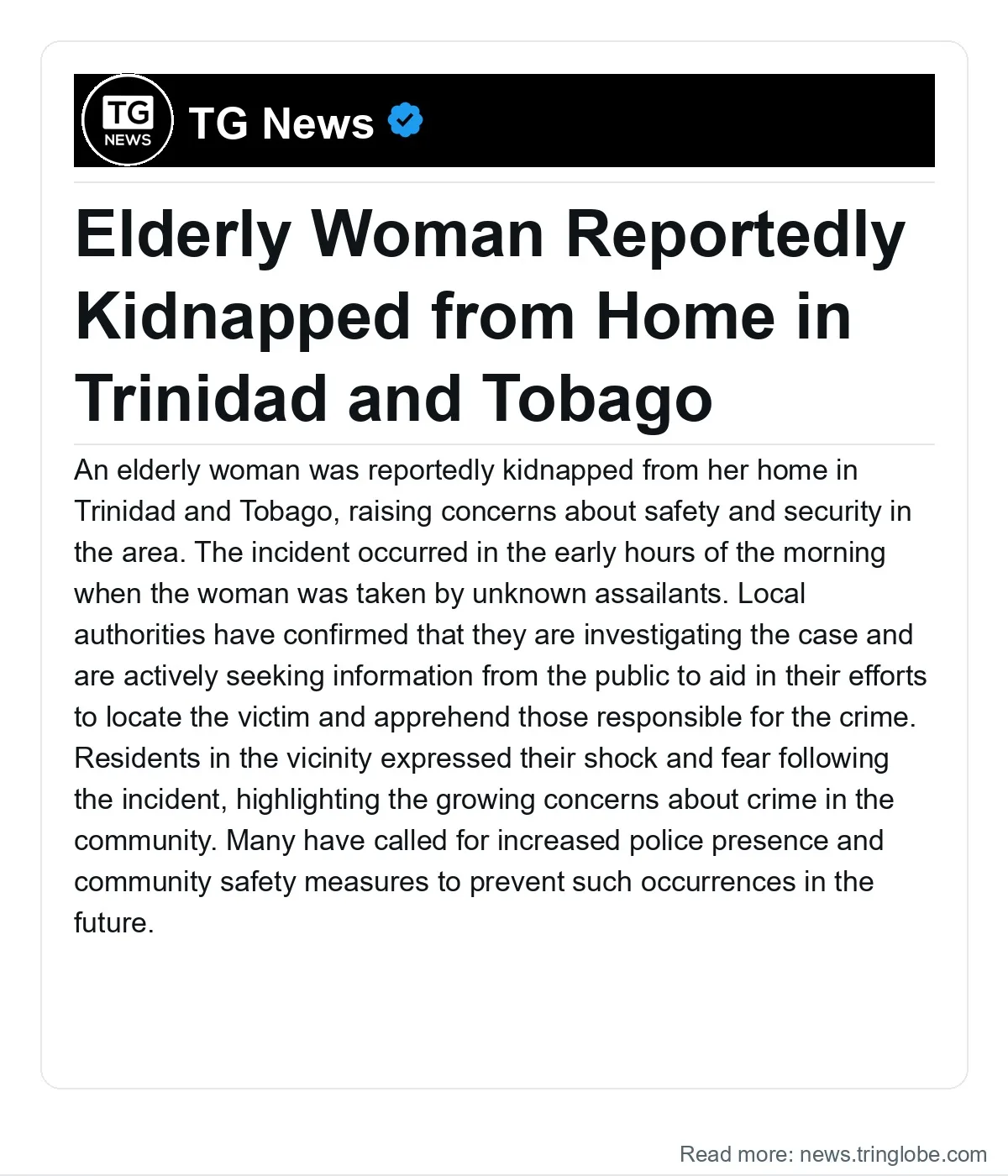 In summary, the reported kidnapping of an elderly woman has raised significant concerns among residents of Trinidad and Tobago. The incident underscores the ongoing challenges related to crime in the area and the need for collaborative efforts between law enforcement and the community to enhance safety. Authorities are actively investigating the case and are seeking public assistance to bring those responsible to justice.
