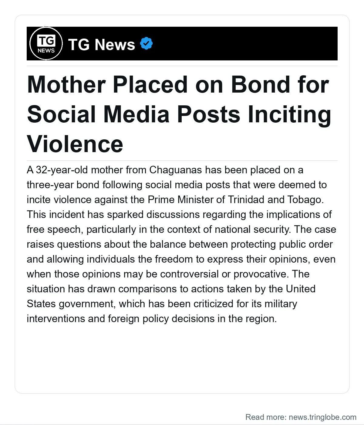 A 32-year-old mother from Chaguanas has been placed on a three-year bond following social media posts that were deemed to incite violence against the Prime Minister of Trinidad and Tobago. This incident has sparked discussions regarding the implications of free speech, particularly in the context of national security.