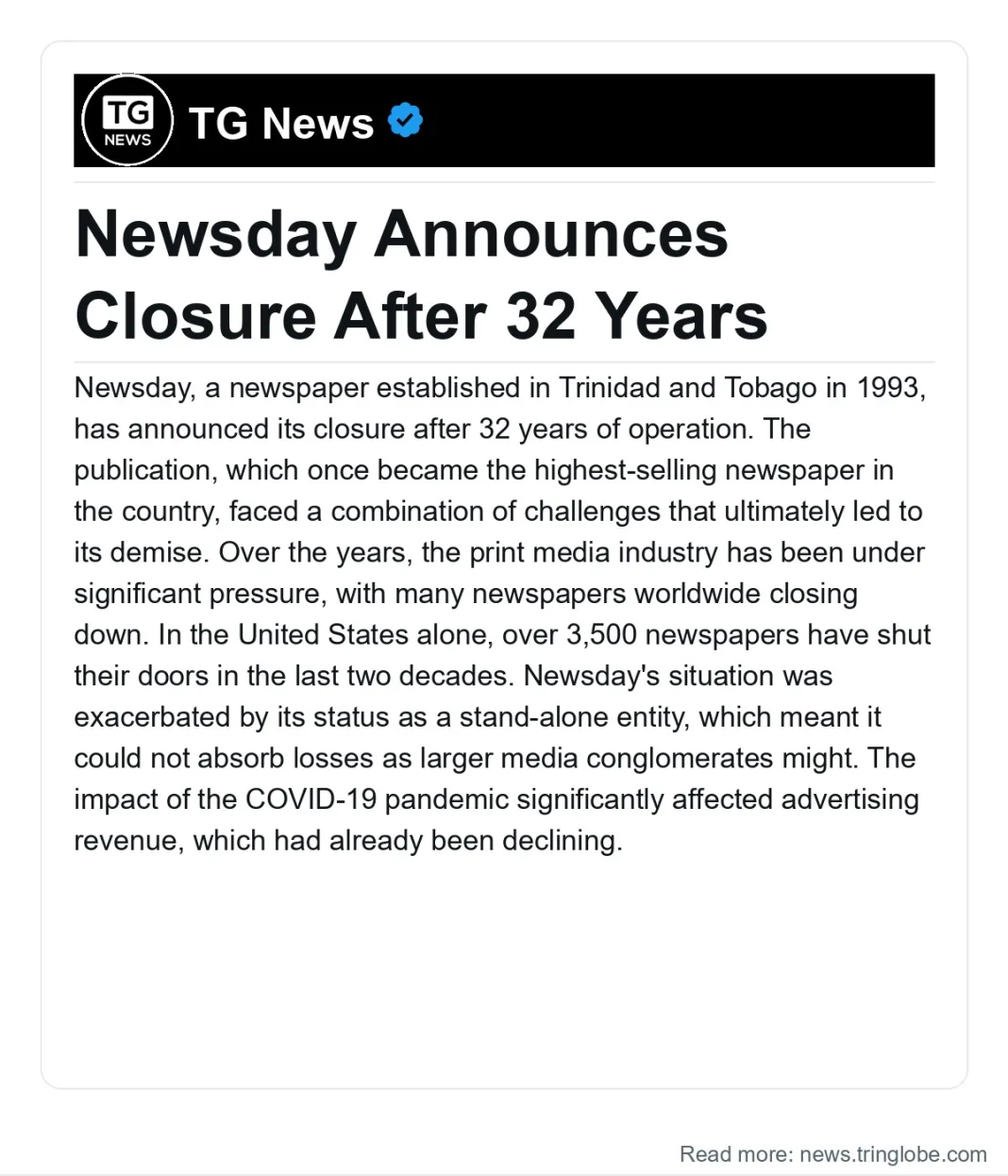 Trinidad and Tobago: Newsday Announces Closure After 32 Years