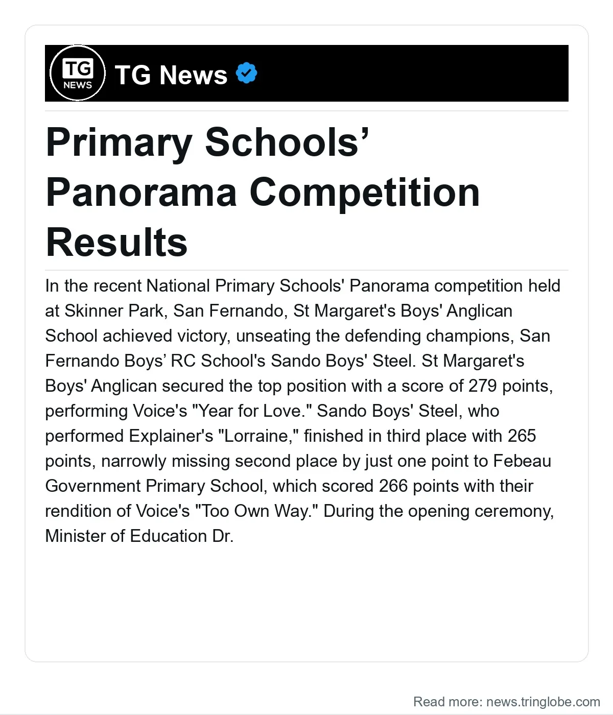 In the recent National Primary Schools’ Panorama competition held at Skinner Park, San Fernando, St Margaret’s Boys’ Anglican School achieved victory, unseating the defending champions, San Fernando Boys’ RC School’s Sando Boys’ Steel. St Margaret’s Boys’ Anglican secured the top position with a score of 279 points, performing Voice’s “Year for Love.” Sando Boys’ Steel, who performed Explainer’s “Lorraine,” finished in third place with 265 points, narrowly missing second place by just one point to Febeau Government Primary School, which scored 266 points with their rendition of Voice’s “Too Own Way.”