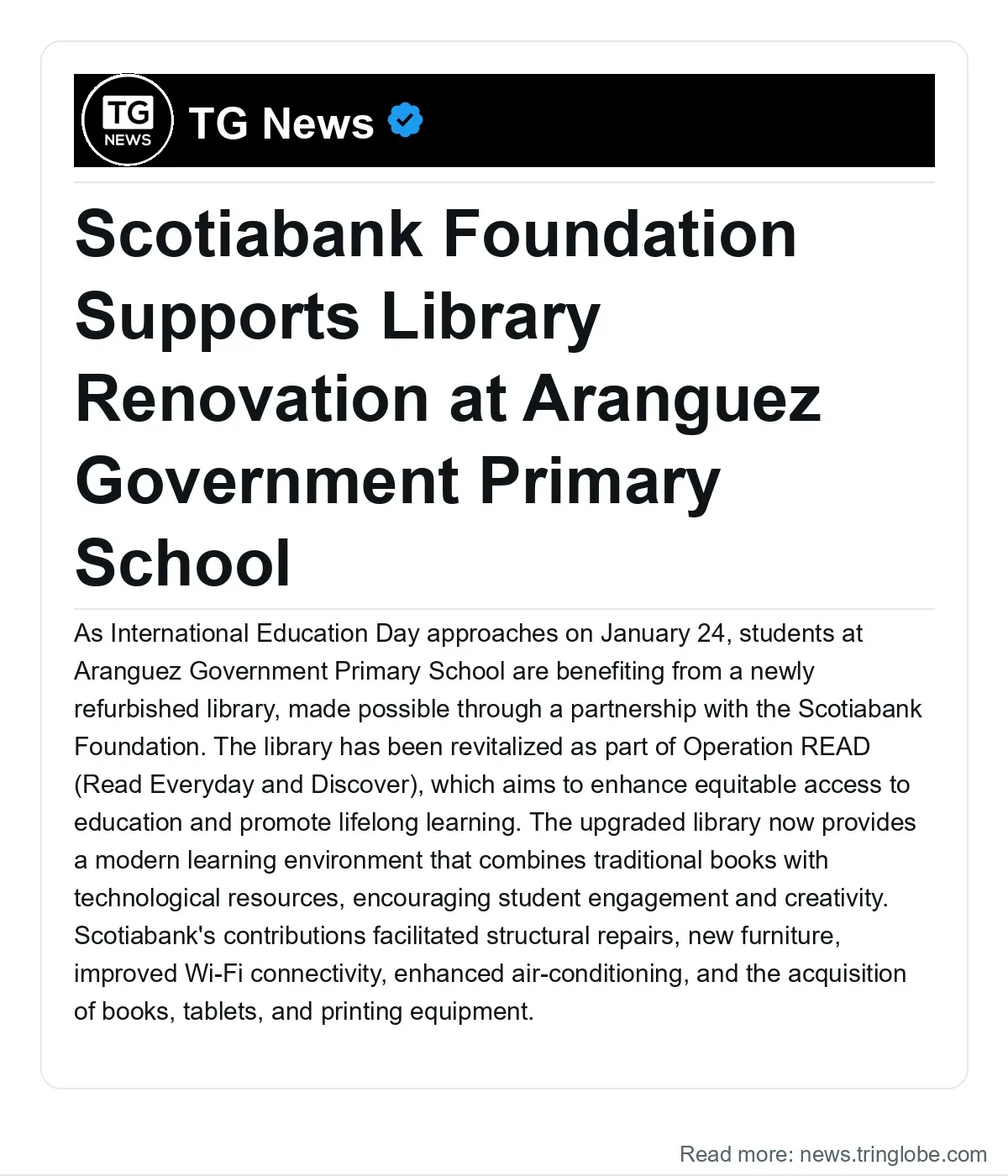As International Education Day approaches on January 24, students at Aranguez Government Primary School are benefiting from a newly refurbished library, made possible through a partnership with the Scotiabank Foundation. The library has been revitalized as part of Operation READ (Read Everyday and Discover), which aims to enhance equitable access to education and promote lifelong learning.