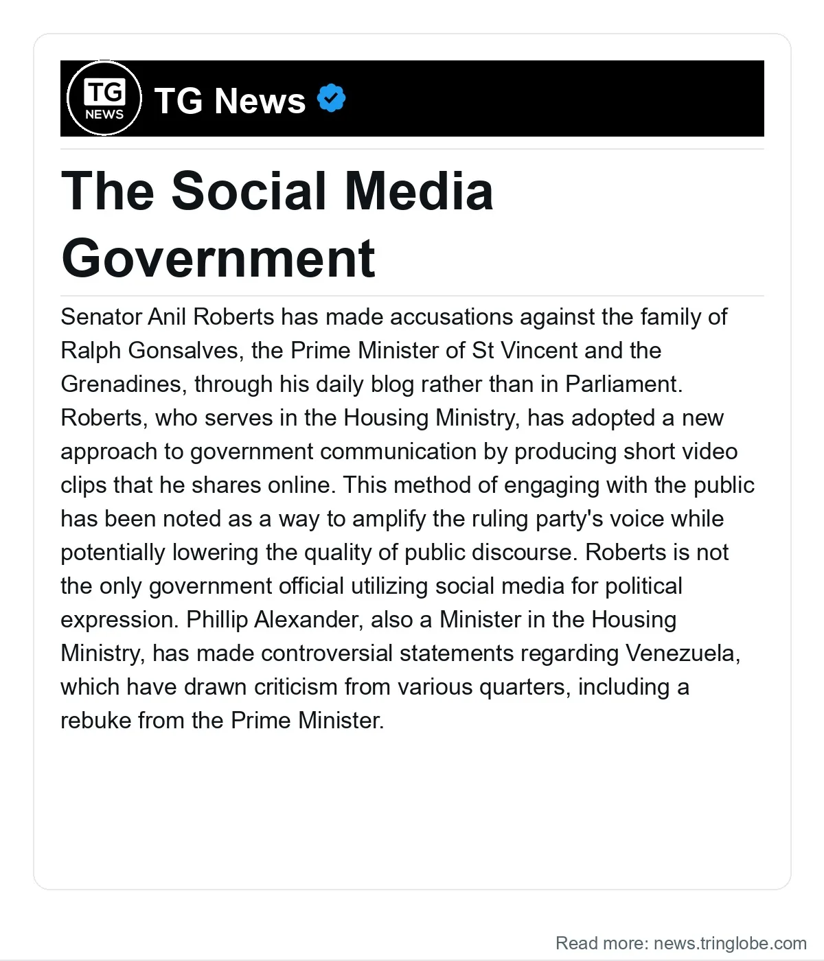 Senator Anil Roberts has made accusations against the family of Ralph Gonsalves, the Prime Minister of St Vincent and the Grenadines, through his daily blog rather than in Parliament. Roberts, who serves in the Housing Ministry, has adopted a new approach to government communication by producing short video clips that he shares online. This method of engaging with the public has been noted as a way to amplify the ruling party’s voice while potentially lowering the quality of public discourse.
